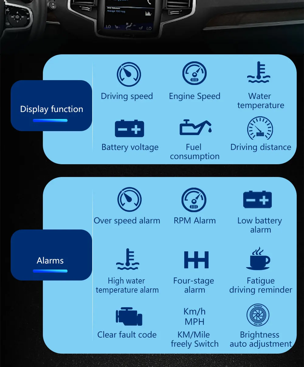 Vehicle speed, water temperature, voltage, fuel consumption, RPM, single mileage, total accumulated mileage, driving time, system time, intake pressure, acceleration test, free switch between kilometers and mileage, KM/h, MPH free switch, °C and °F Switch freely...
