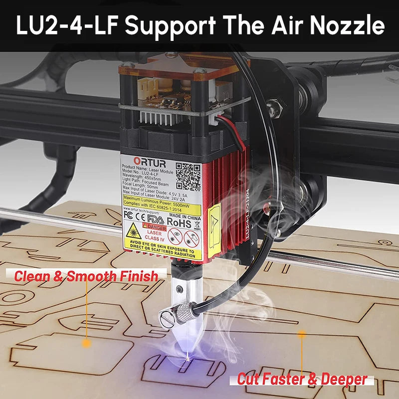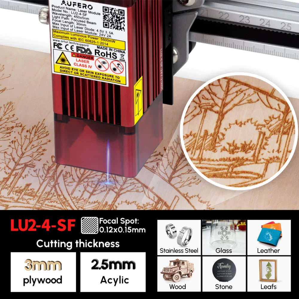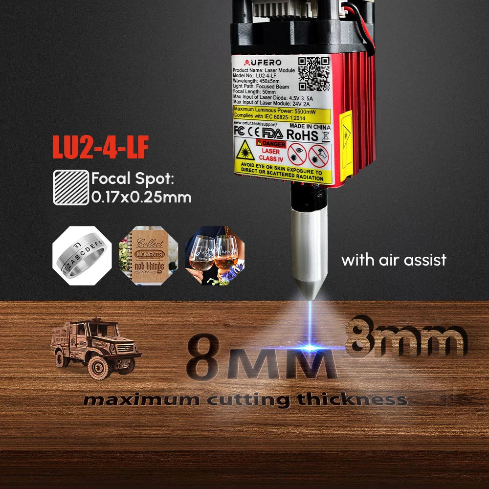 LU2-4-SF short focus laser module of the laser engraver has a real luminous power of 4,500-5,500mw and 0.12 x 0.15mm focal spot. With high power compressed spot, it is good at cutting and better at engraving hard materials.