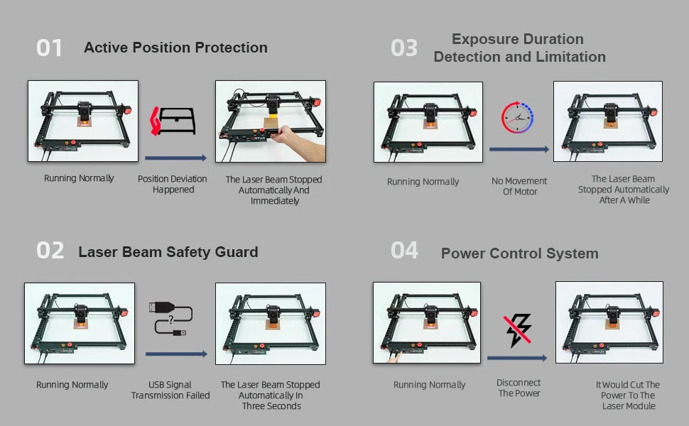 3. Exposure Duration Detection and Limitation: When the motors have no movement for a while, it would automatically stop the laser.