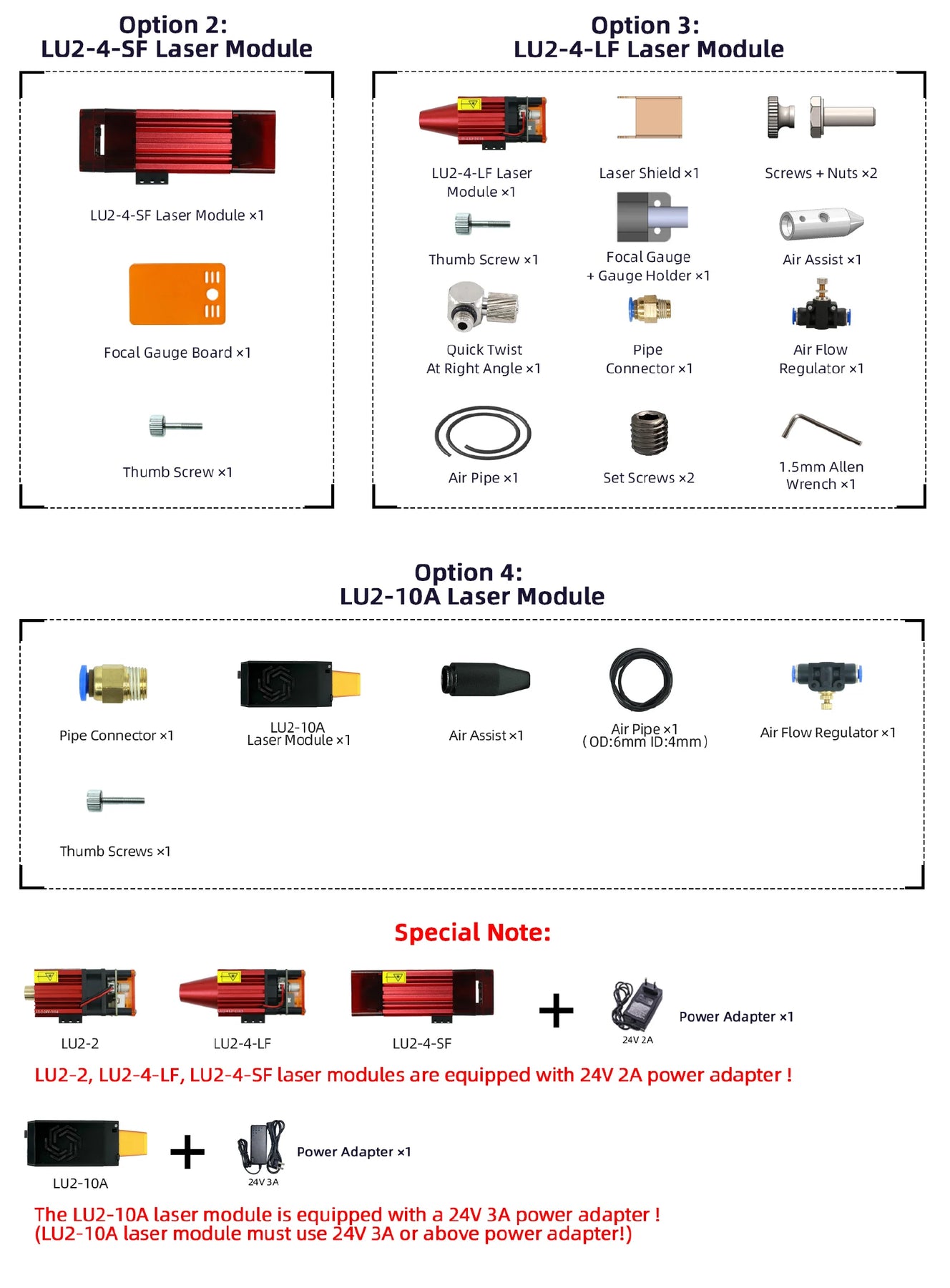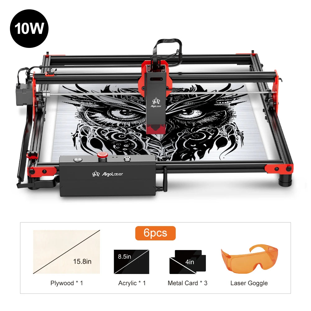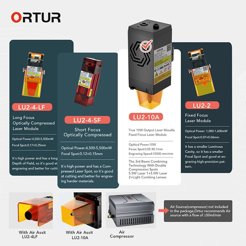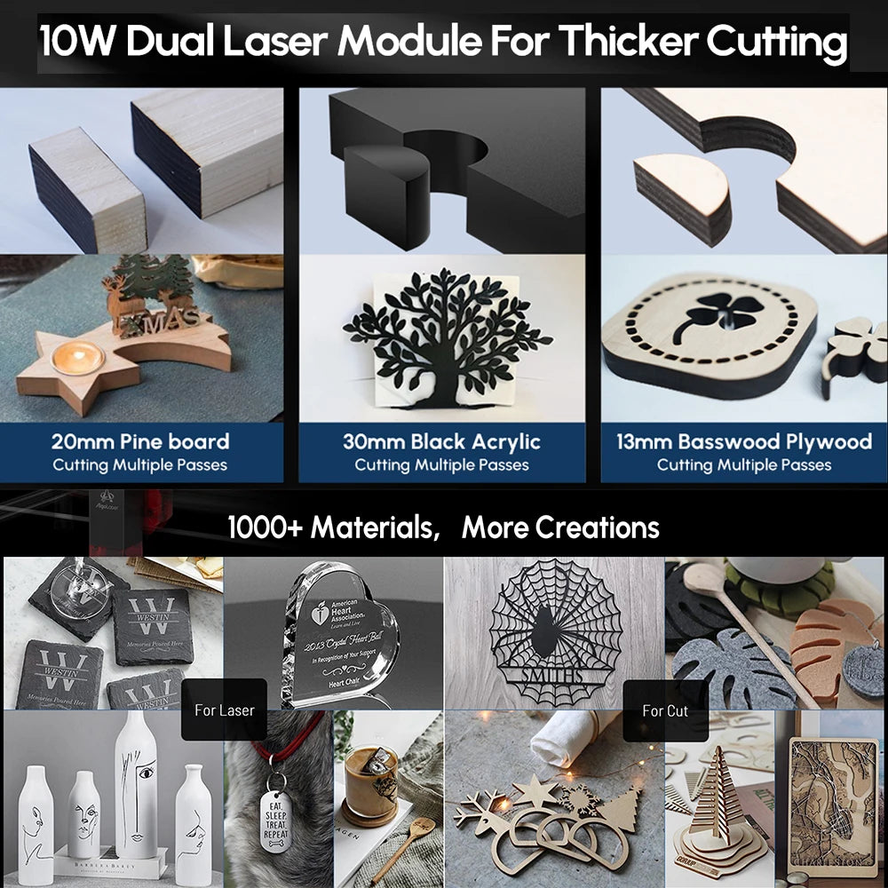 LU2-10A:More Powerful Engraving with True 10W Output Power LU2-10A is newly upgraded with a 10W laser module, which makes the cutting speed up to 15,000 mm/min. The compressed point is 0.05mm x 0.1mm.The optical power reaches to 10W. It can cut 30mm acrylic and 20mm wood. At the same time, the laser module of the engraving machine has a built-in air-assist interface, which is designed for cutting.