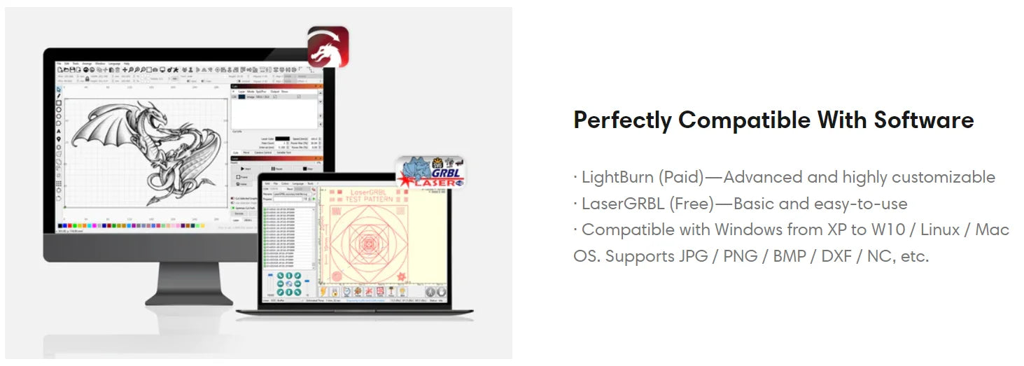 ② LightBurn (paid software, ) supports Windows XP, 7, 8, 10,11, Mac OS, Linux