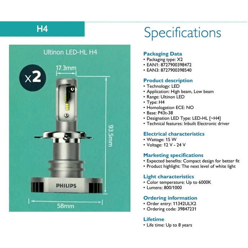 Philips LED H4 9003 Ultinon LED Auto Hi/lo Beam 6000K Cool White Light +160% Brighter Headlight Compact Design 11342ULX2, Pair