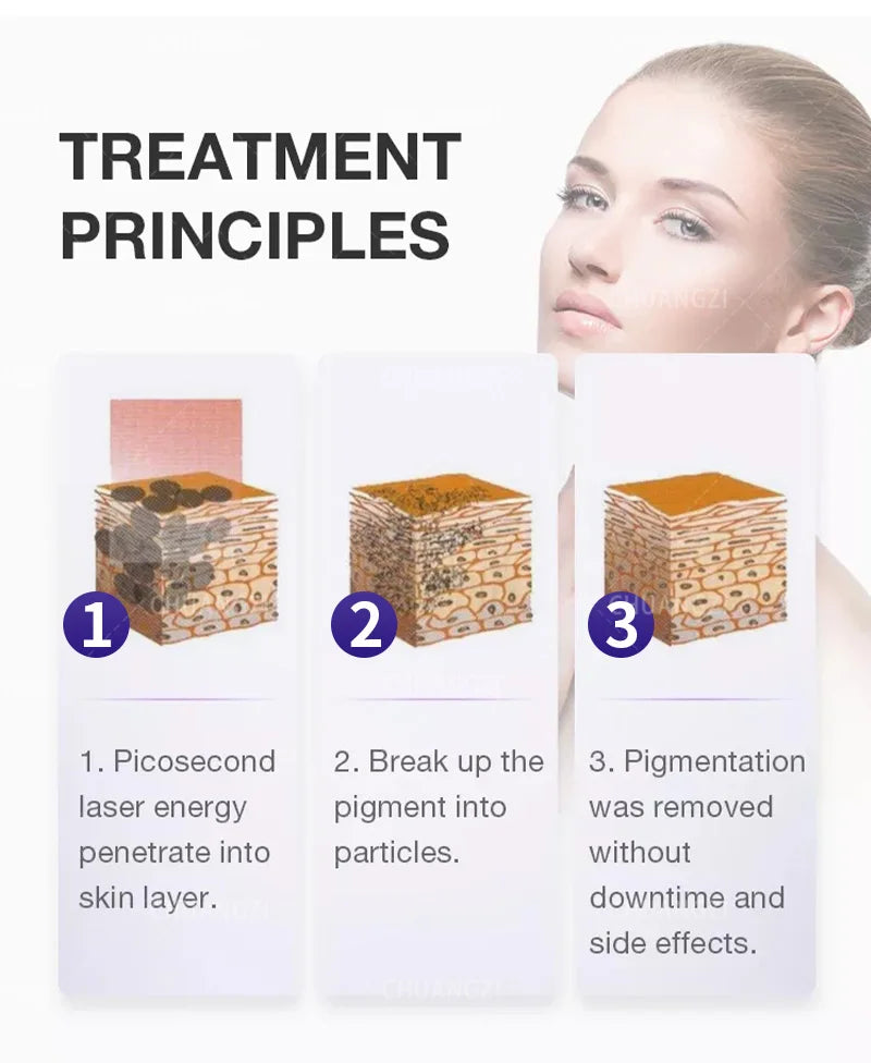2.The laser pulses in nanosecond range with very high energy. When the laser is absorbed by according pigment,the pigment mass expands quickly and breaks into particles which are eliminated through phagocytes.