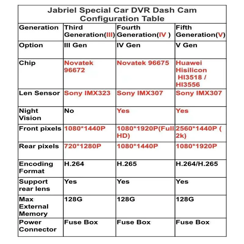 Jabriel Special Car DVR Dash Cam Configuration Table