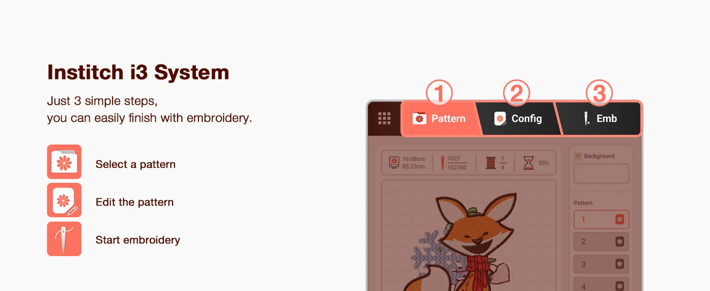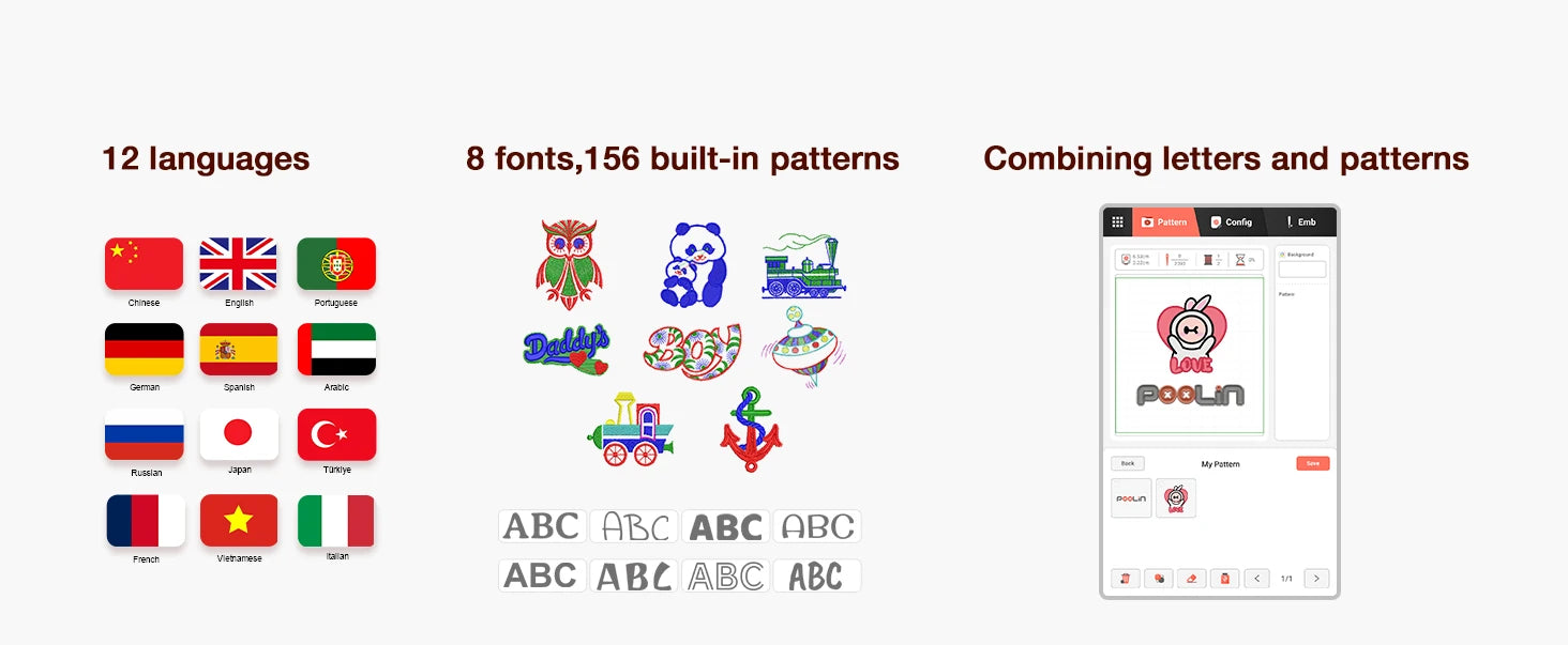 Our machines support the format of DST or DSB.Embroidery software not included,as long as the software meets the DST or DSB format, our embroidery machines support it. If you have advanced requirements for design patterns, it is recommended to buy Wilcom/Hatch/Embrilliance, and you can find teaching videos on their official website or channel.