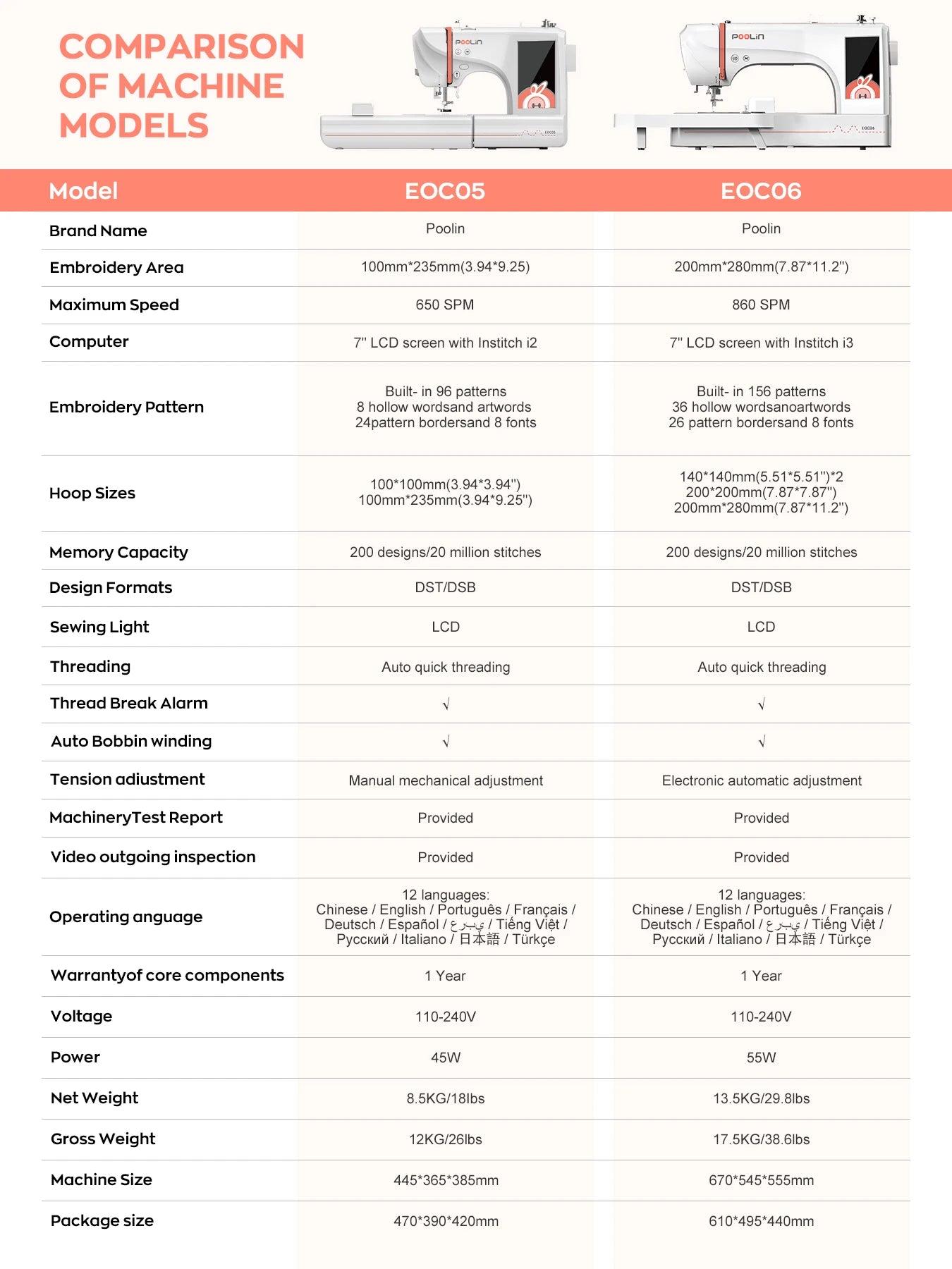 The maximum embroidery area of EOC06 is 200X280mm, and it is equipped with four embroidery frames. And the speed can reach 860/min. The electronic control is upgraded to version 3.0, which is more stable.The maximum embroidery area of 05 is 100*235mm, and it is only equipped with 2 embroidery frames.