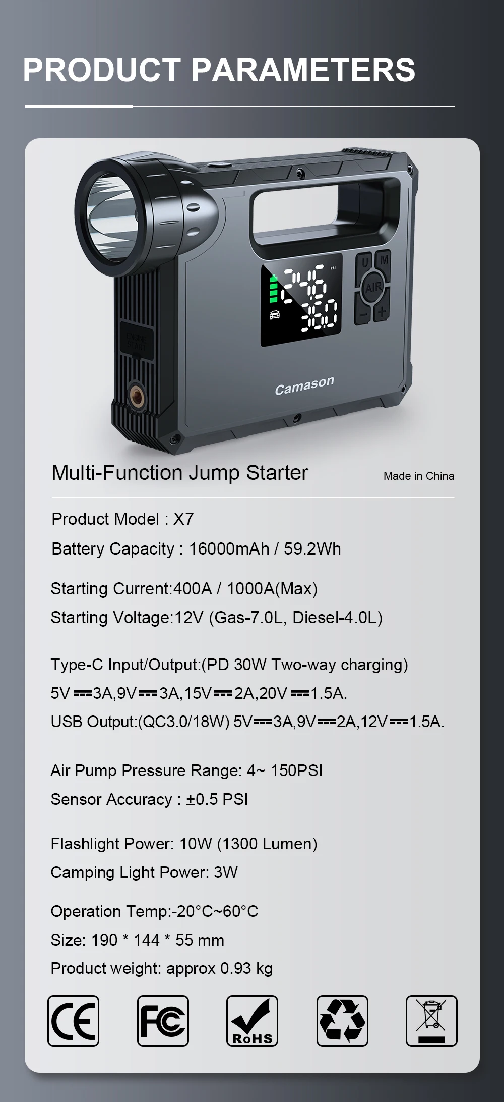 1. Car Jump Starter: 16000mAh, Peak current 1000A.