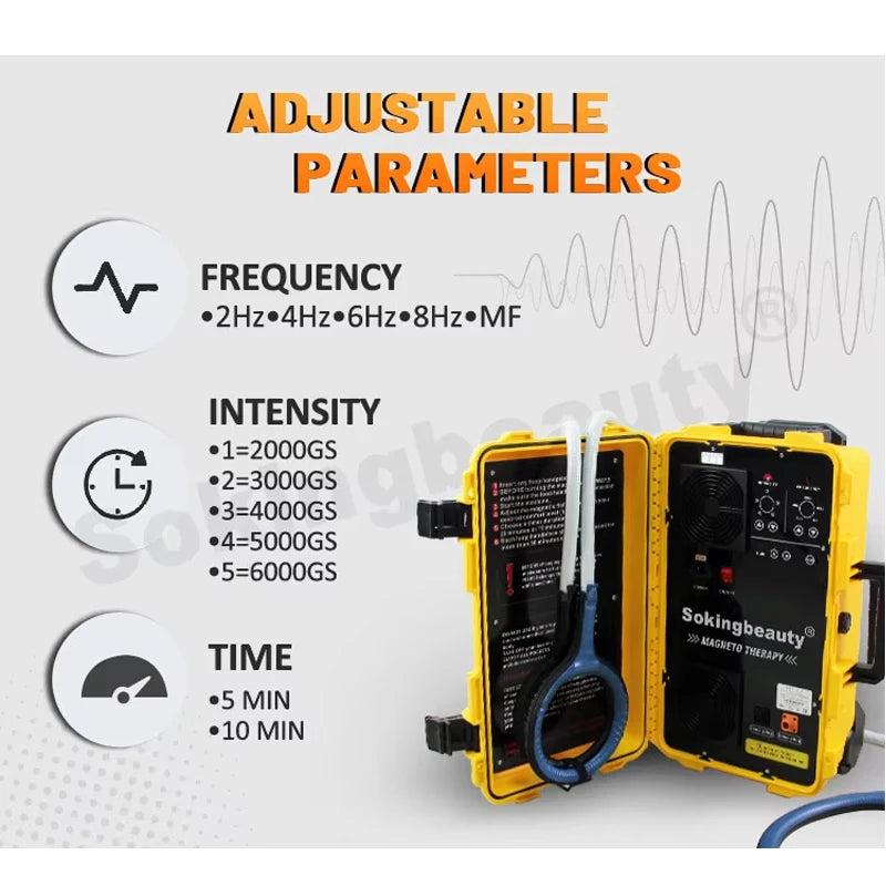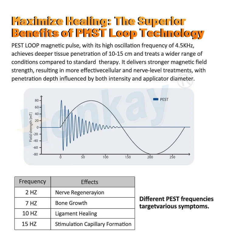 PEST LOOP magnetic pulse, with its high oscillation frequency of 4.5KHz,achieves deeper tissue penetration of 10-15 cm and treats a wider range of conditions compared to standard therapy. It delivers stronger magnetic field strength, resulting in more effectivecellular and nerve-level treatments, with penetration depth influenced by both intensity and applicator diameter.