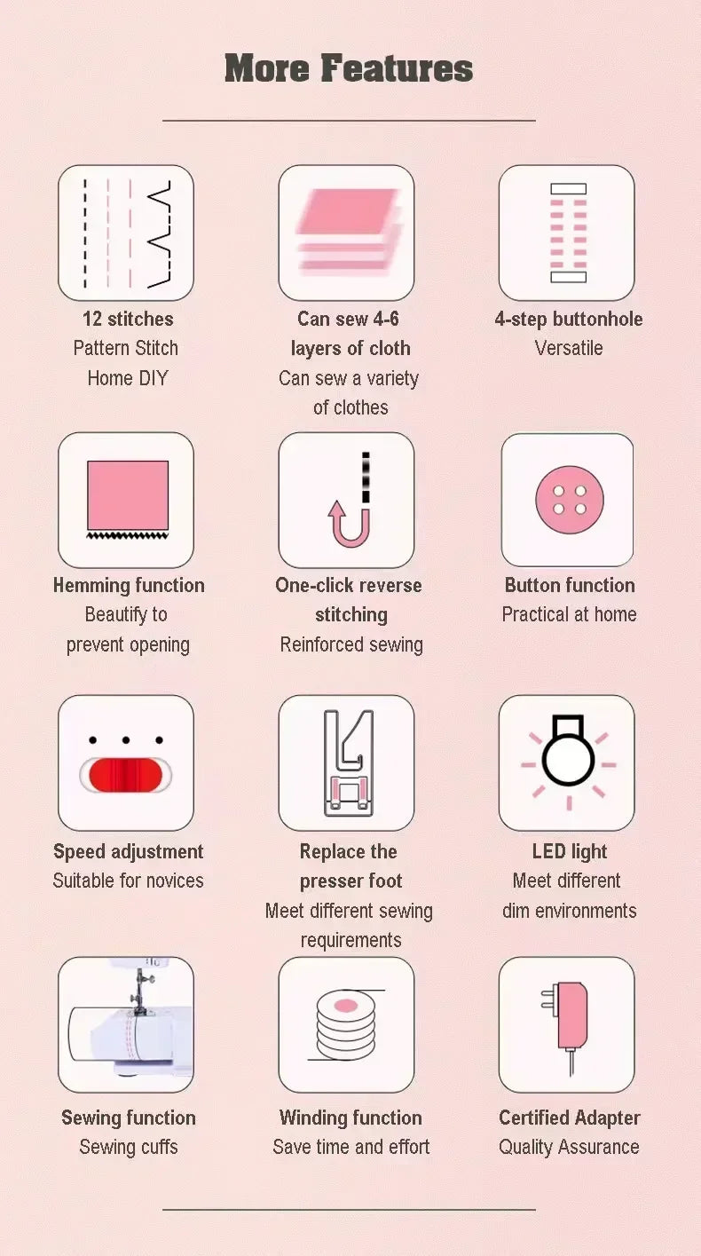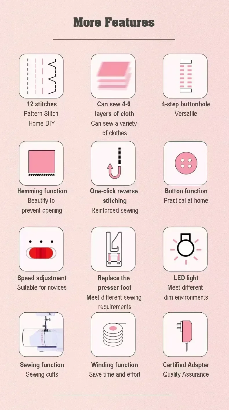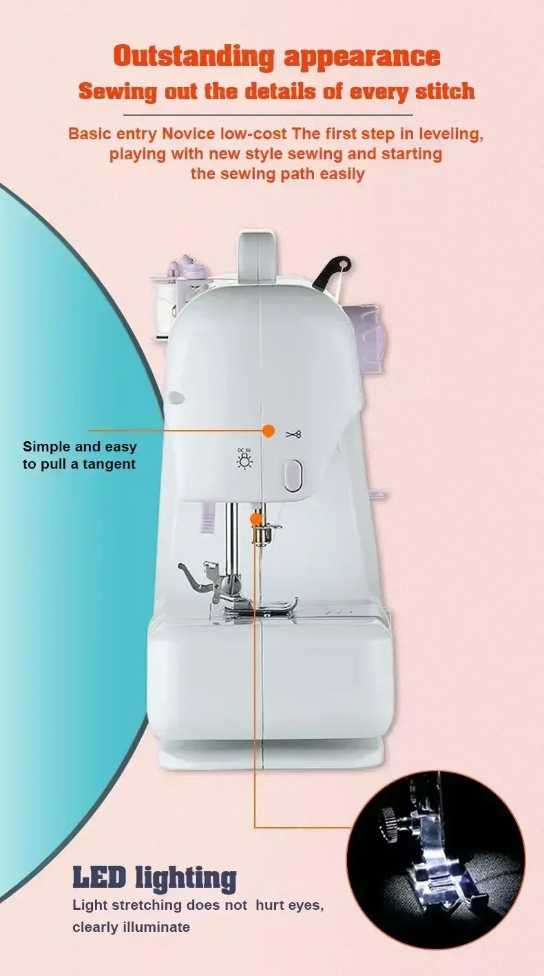1. Compact and Lightweight Design: The portable sewing machine is ideal for beginners and advanced users alike, offering a lightweight design that is easy to store and carry. Whether you're working with heavy cotton or delicate silks, this machine meets various fabric needs, making it a versatile addition to your crafting tools.