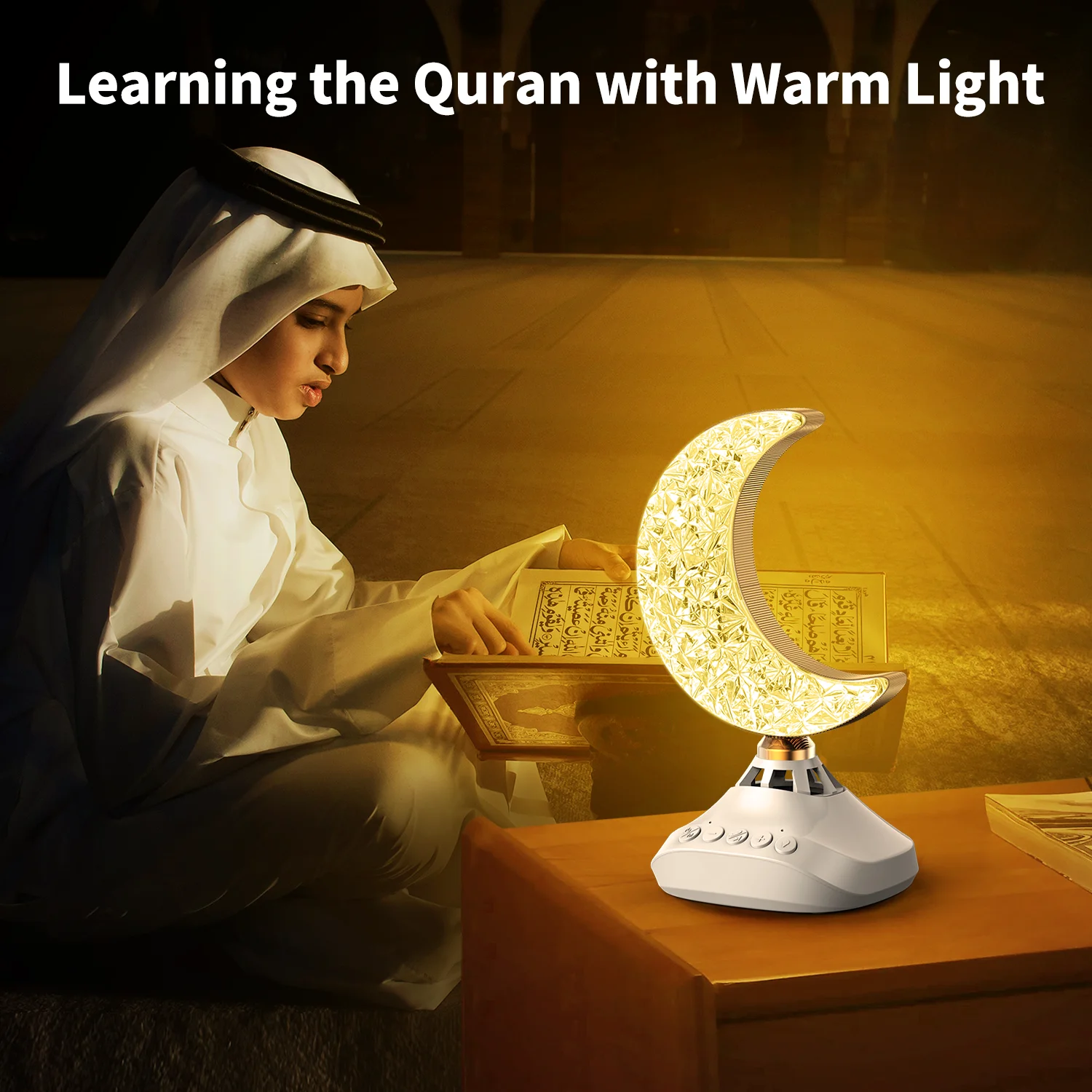 SQ-830 is the latest high-quality Quran lamp speaker in 2023. The exquisite crescent lamp body is composed of optical-grade acrylic and high-brightness light source. The three-level light mode is adjustable, and 16 colors of light are optional. Adjust the appropriate light source May relieve eye fatigue. It with the stable base design and button switch design, you to freely choose to play Quran chapters and adjust various lights. It can also control lights and play Quran through APP and remote control, making your life more intelligent. This product has a built-in 2000mah lithium battery, and can be recharged through USB type-C, the charging is safe and fast, and it is suitable for a variety of devices. and simple crescent moon lamp design can not only decorate your home but also adapt to the atmosphere of multiple scenes, adding a fun to our life.