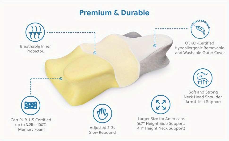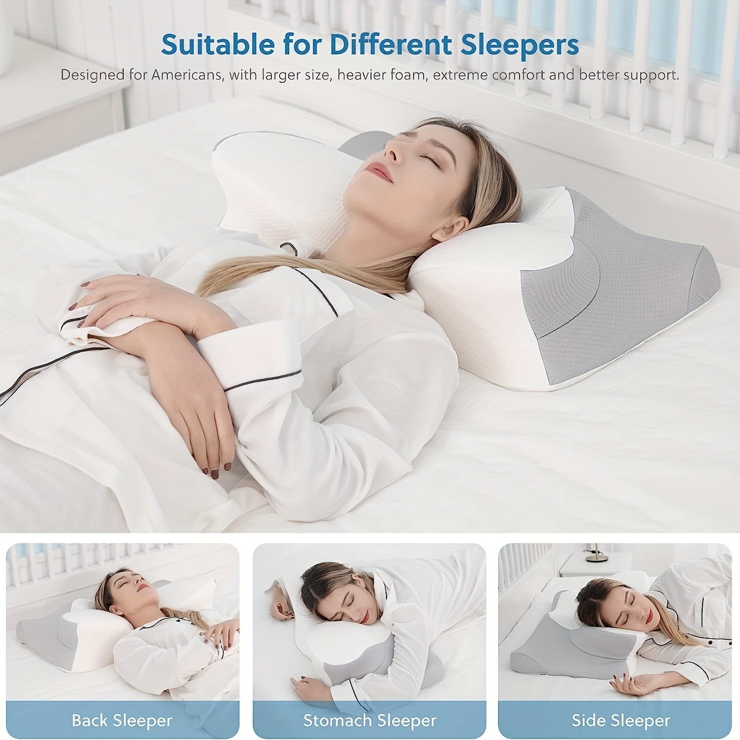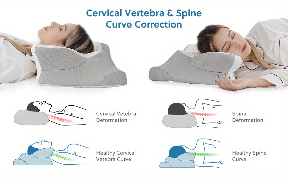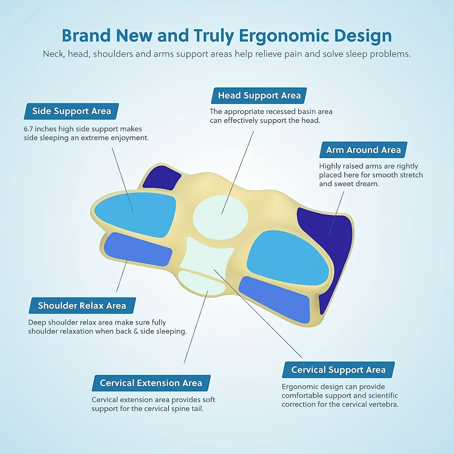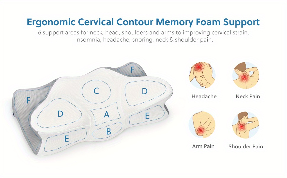 BRAND NEW AND TRULY ERGONOMIC DESIGN: The new ergonomically designed cervical contour memory foam pillow integrates 6 contour support areas scientifically. Providing soft comfy and firm support for neck, head, shoulders and arms precisely and perfectly. Reducing stress of cervical vertebra and spine during sleep. Improving sleep and relieving neck and shoulder pain.