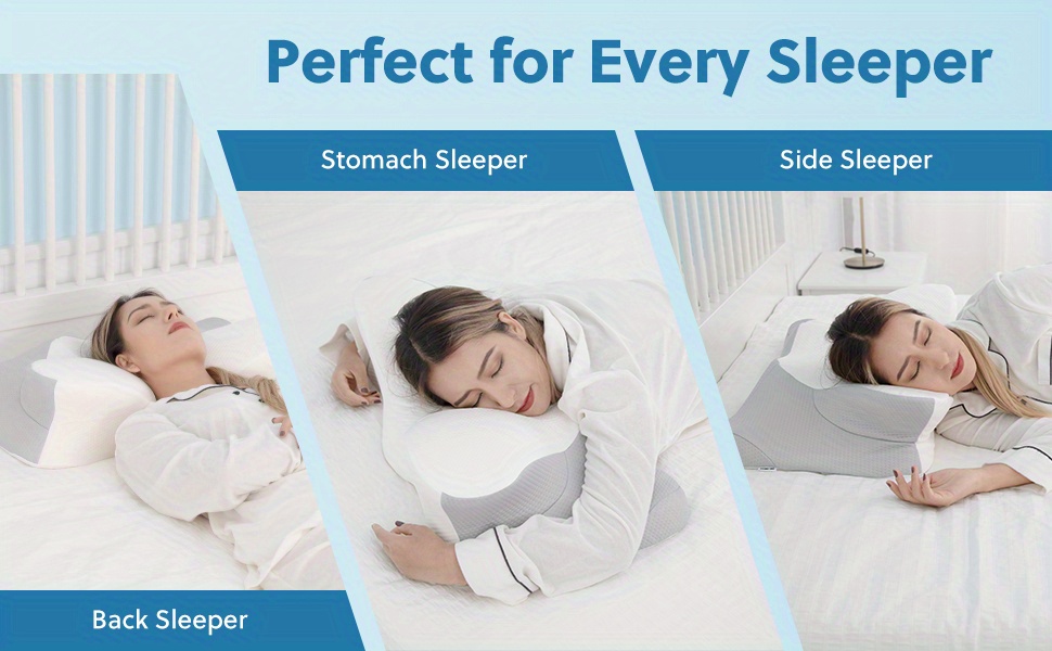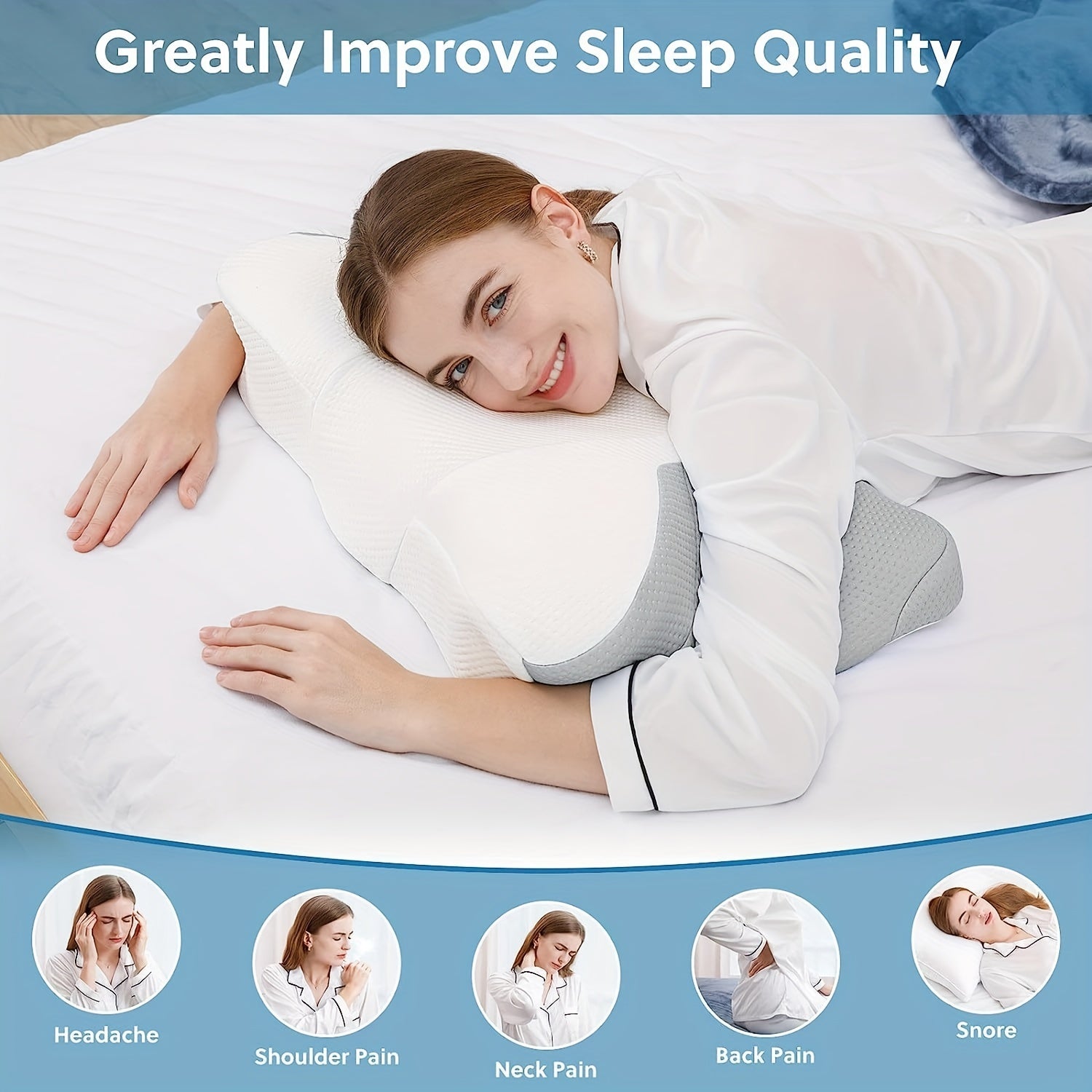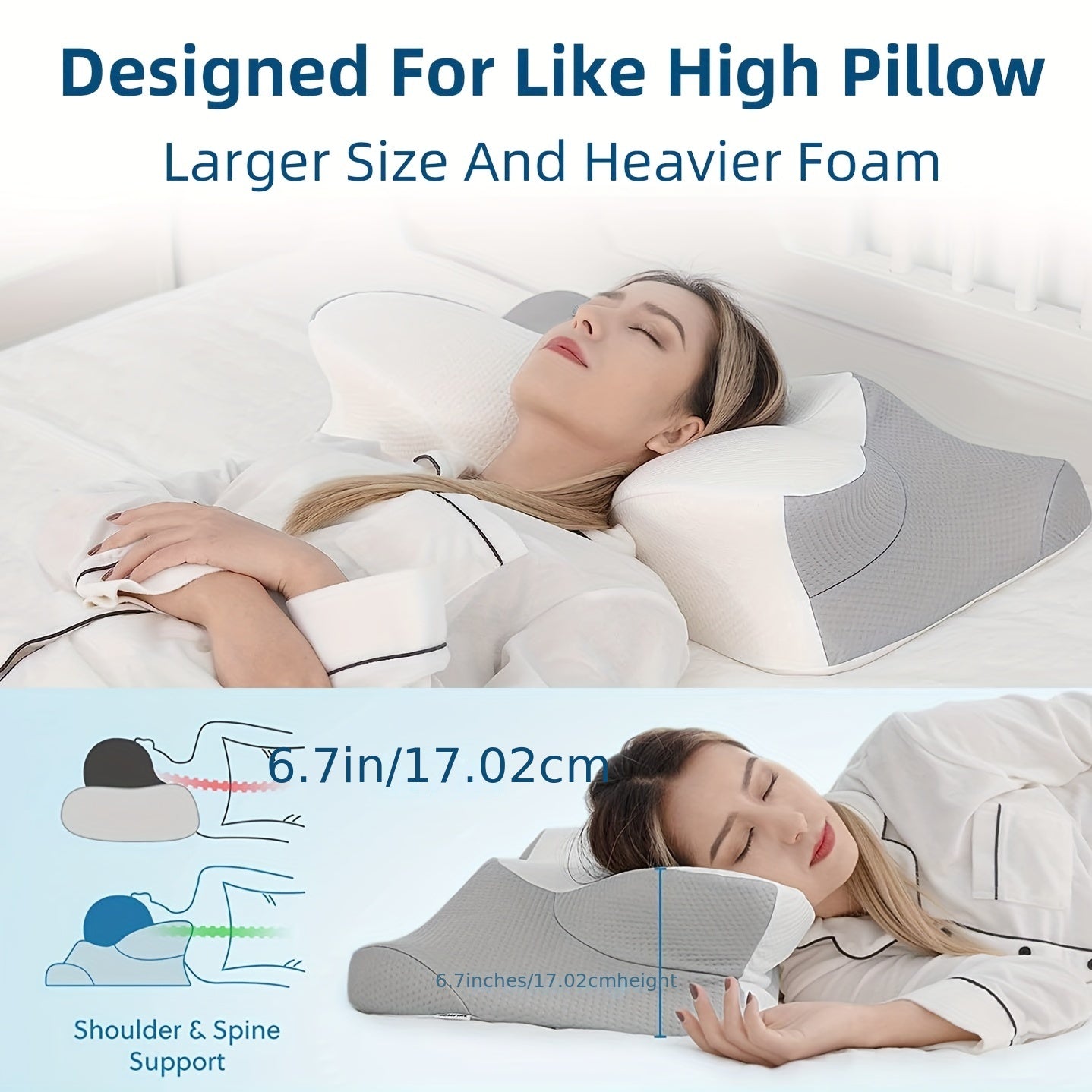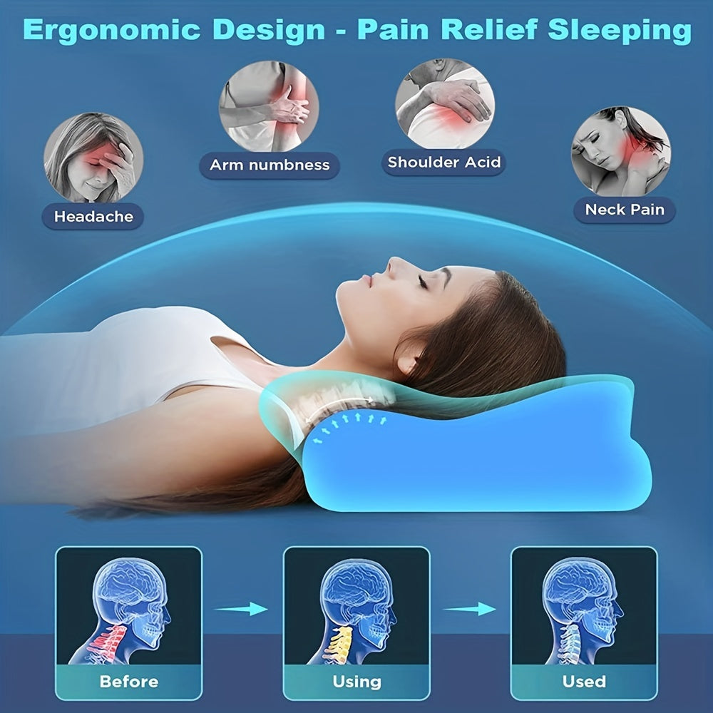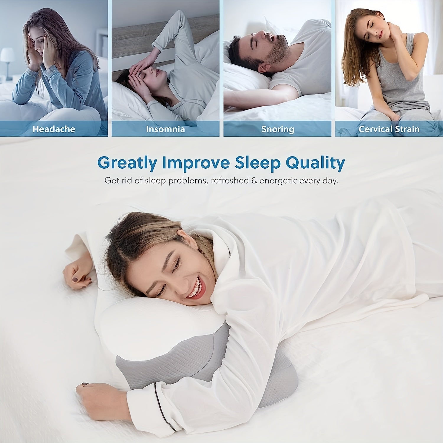 BRAND NEW AND TRULY ERGONOMIC DESIGN: The new ergonomically designed cervical contour memory foam pillow integrates 6 contour support areas scientifically. Providing soft comfy and firm support for neck, head, shoulders and arms precisely and perfectly. Reducing stress of cervical vertebra and spine during sleep. Improving sleep and relieving neck and shoulder pain.