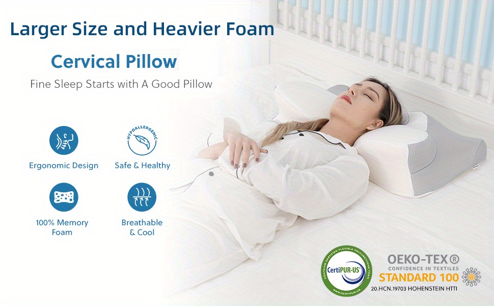 PREMIUM CERVICAL PILLOW: Integrated with softness, comfort and strong support, 100% high-density 3S slow rebound memory foam is premium durable and can always provides you with comfy support. CertiPUR-US certified memory foam and OEKO-TEST 100 certified removable and washable microfiber pillowcase are 100% healthy and safe. Allowing you to easily enjoy the pleasure and relaxation of sleep all the time.