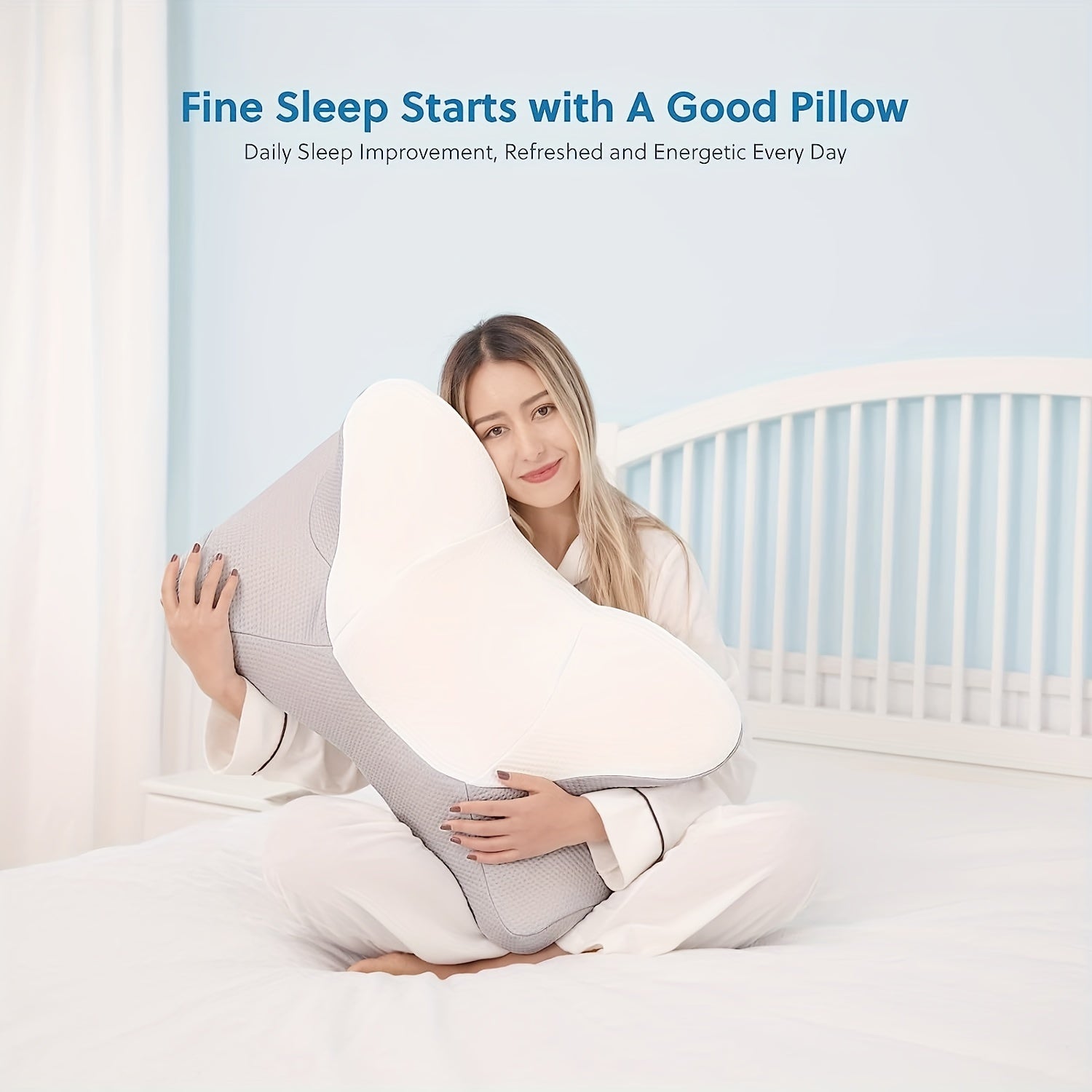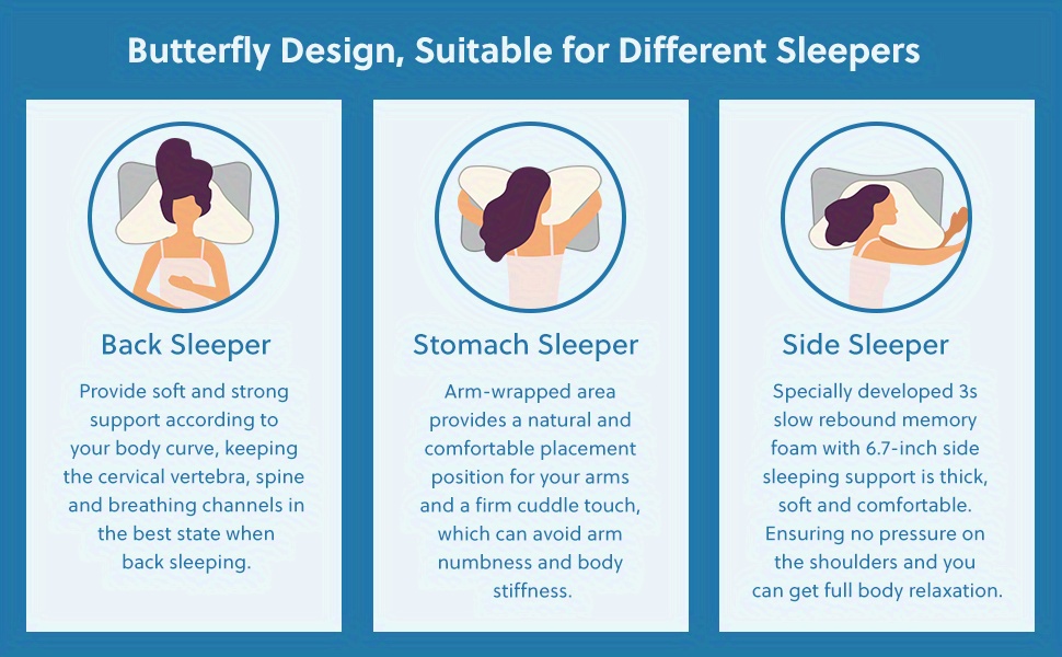 PERFECT FOR DIFFERENT SLEEPERS: In addition to the protection of the cervical vetebra and spine when back sleeping, specially developed 3s slow rebound memory foam with 6.7" side sleeping support is thick, soft and comfy. Ensuring no pressure on the shoulders to get full body relaxation. Arm-wrapped area provides natural placements for your arms and a firm cuddle touch to avoid arm numbness and body stiffness when stomach sleeping.