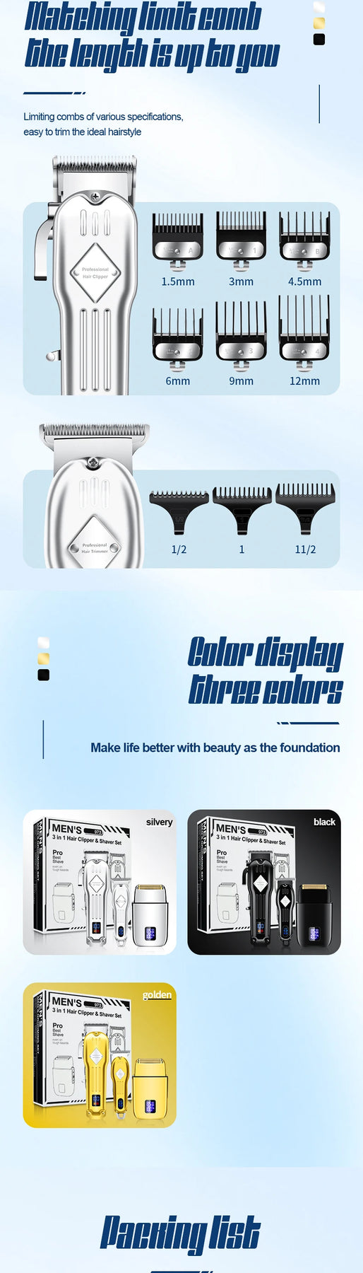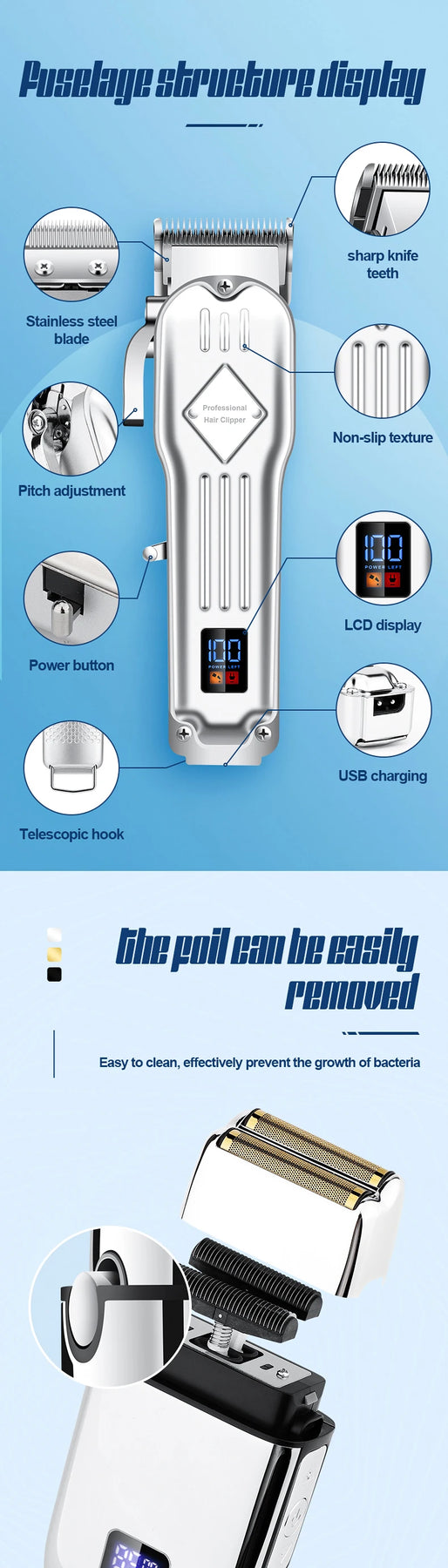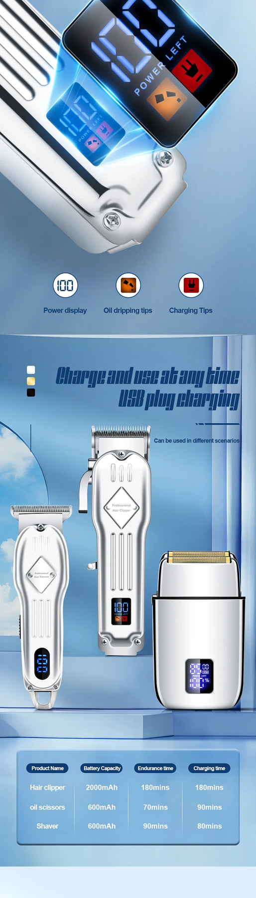 Product features: LCD power display, shaver 3-speed adjustment, metal body