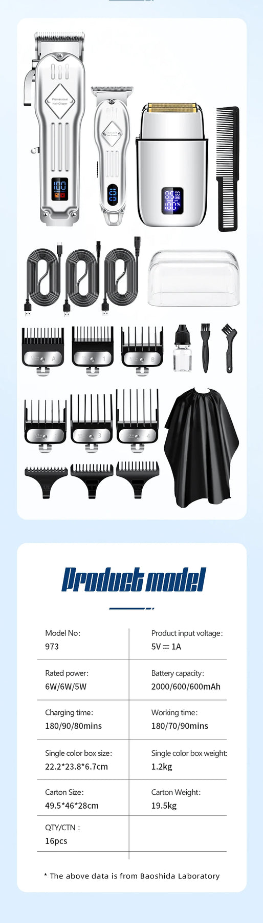 Battery capacity: shaver 600mAh, large Hair clipper 1000mAh, small Hair clipper 600mAh