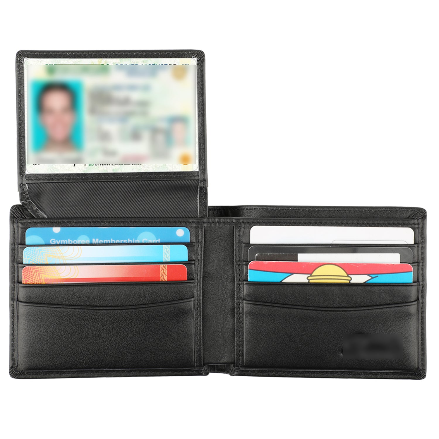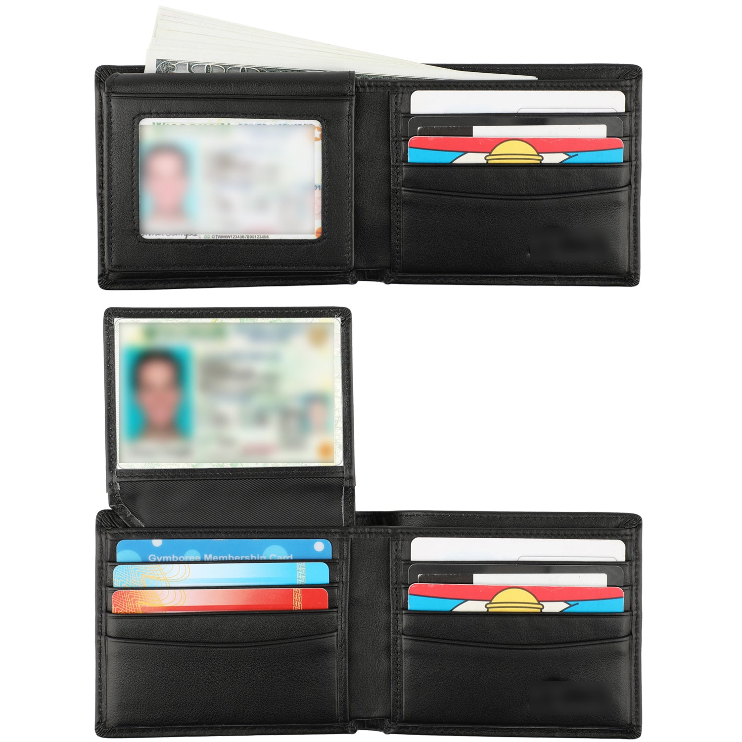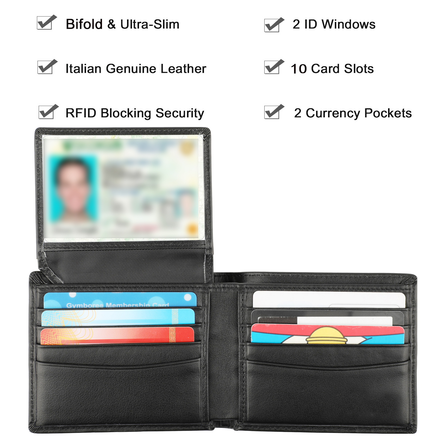 RFID Blocking Cowhide Leather Bifold Wallet For Men With 2 ID Windows Black