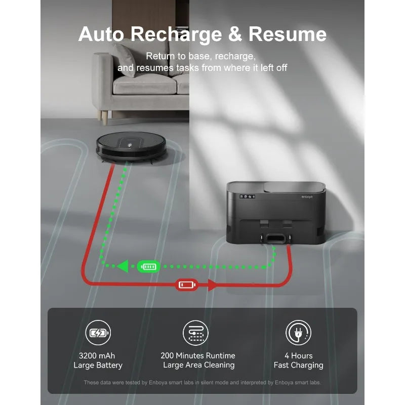 - [๐๐จ๐ง๐ ๐๐๐ญ๐ญ๐๐ซ๐ฒ ๐๐ข๐๐ & ๐๐ฎ๐ญ๐จ ๐๐๐๐ก๐๐ซ๐ ๐ข๐ง๐ ]: Fast charging takes only 4 hours to go from empty to full. A single cleaning session provides 200 minutes of runtime, sufficient to meet the needs of most households. If the robotic vacuum has completed its cleaning path or runs out of battery during the cleaning process, it will automatically return to the self-emptying base for recharging.
