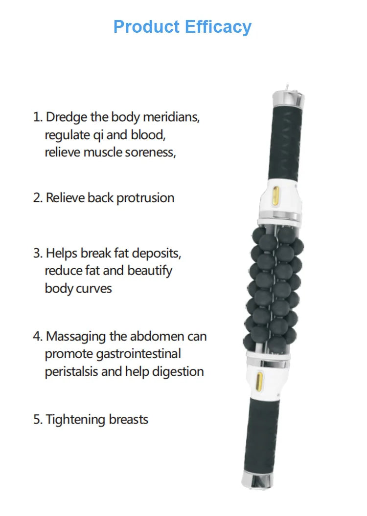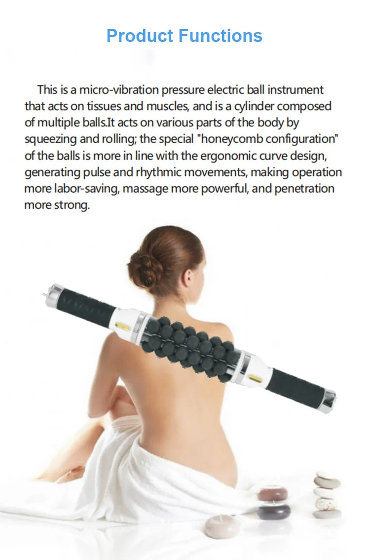 This is a micro-vibration pressure electic ball instrument that acts on tissues and muscles, and it is a cylinder composed of multiple balls. It acts on various parts of the body by squeezing and rolling, the special " honeycomb configuration " of the balls is more in line with the ergonomic curve design, generating pulse and rhythmic moverments, making operation more labor-saving, massage more powerful, and penetration more strong.