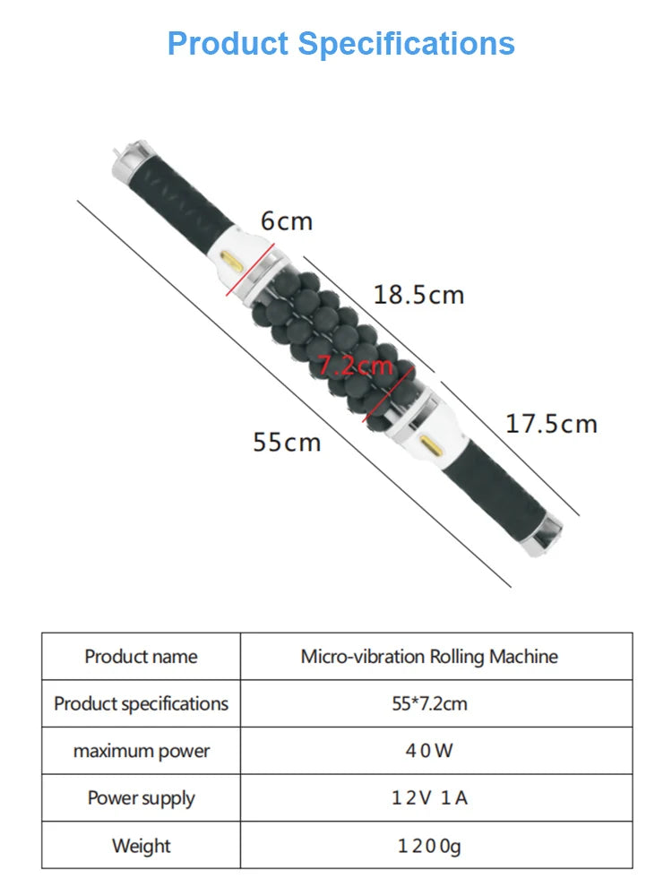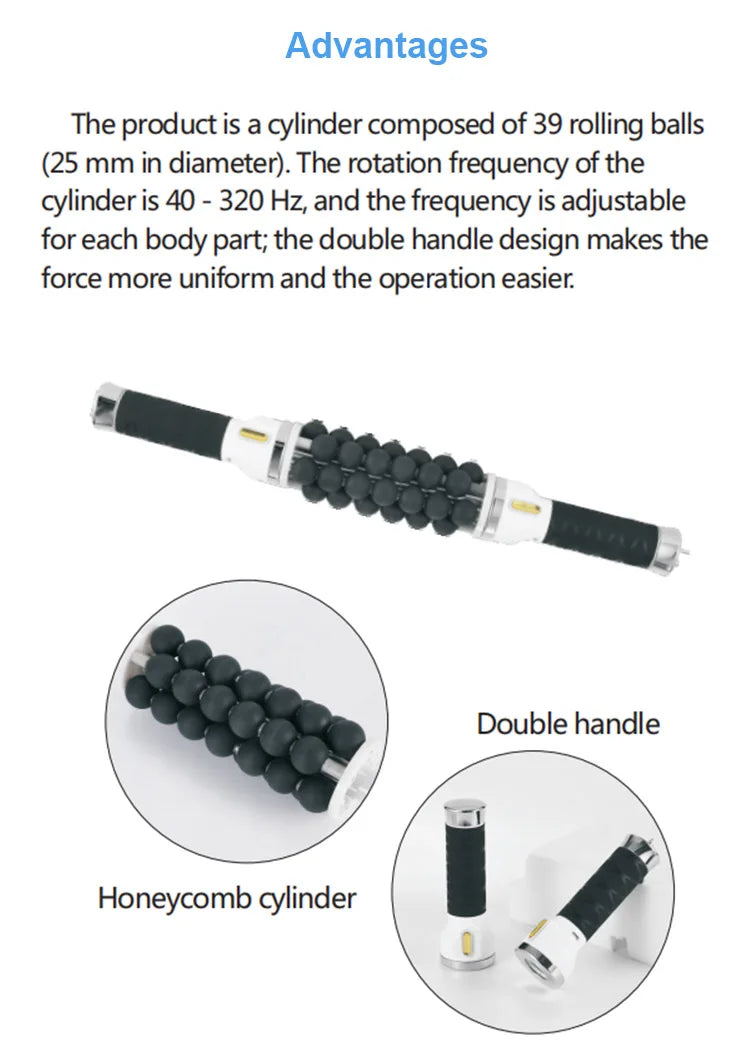 The product is a cylinder composed of 39 rolling balls (25 mm in diameter ). The rotation frequency of the cylinder is 40 - 320 Hz, and the frequency is adjustable for each body pat, the double handle design makes the force more uniform and the operation easier.