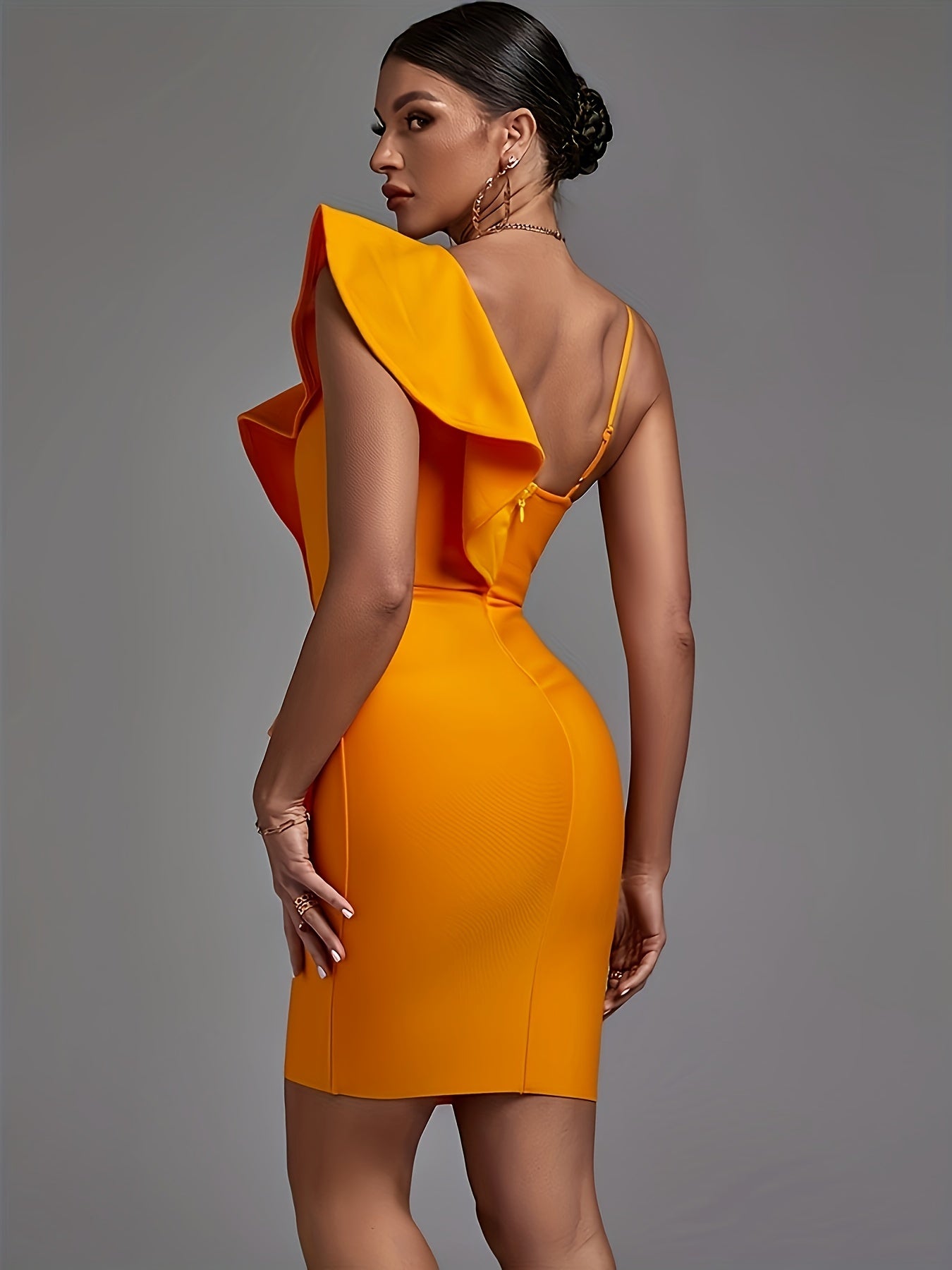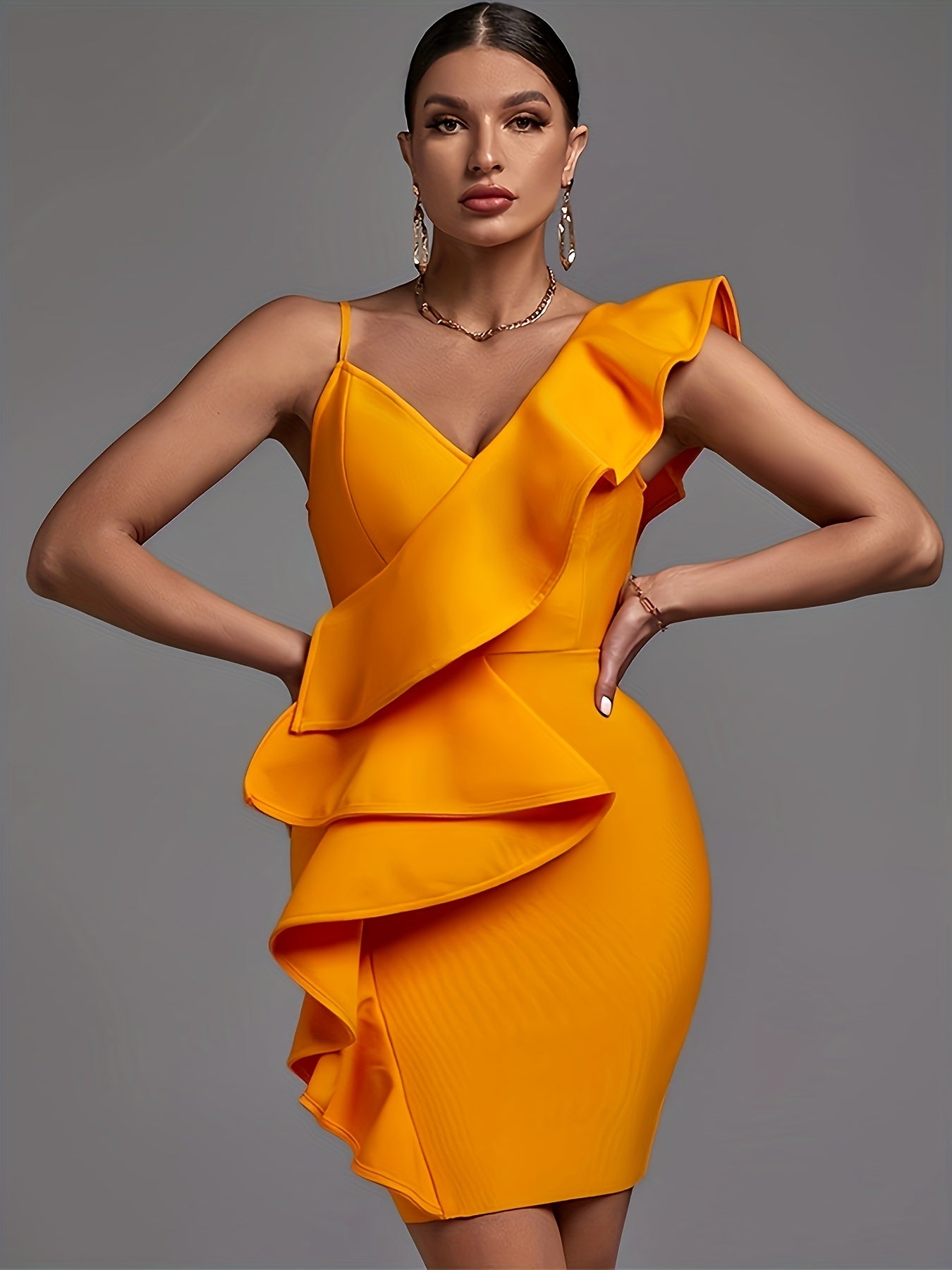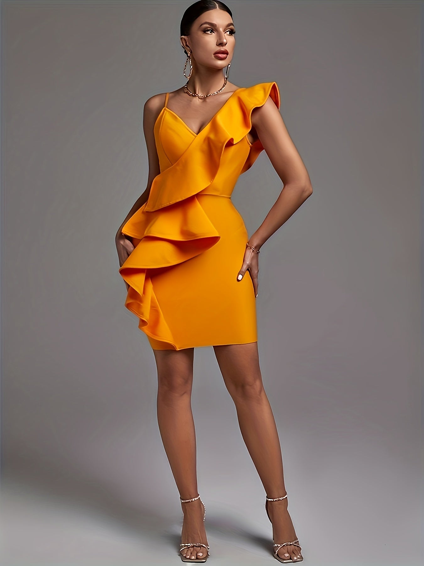 Ruffle Trim Asymmetric Shoulder Dress, Elegant V-neck Sleeveless Dress For Party & Banquet, Women's Clothing