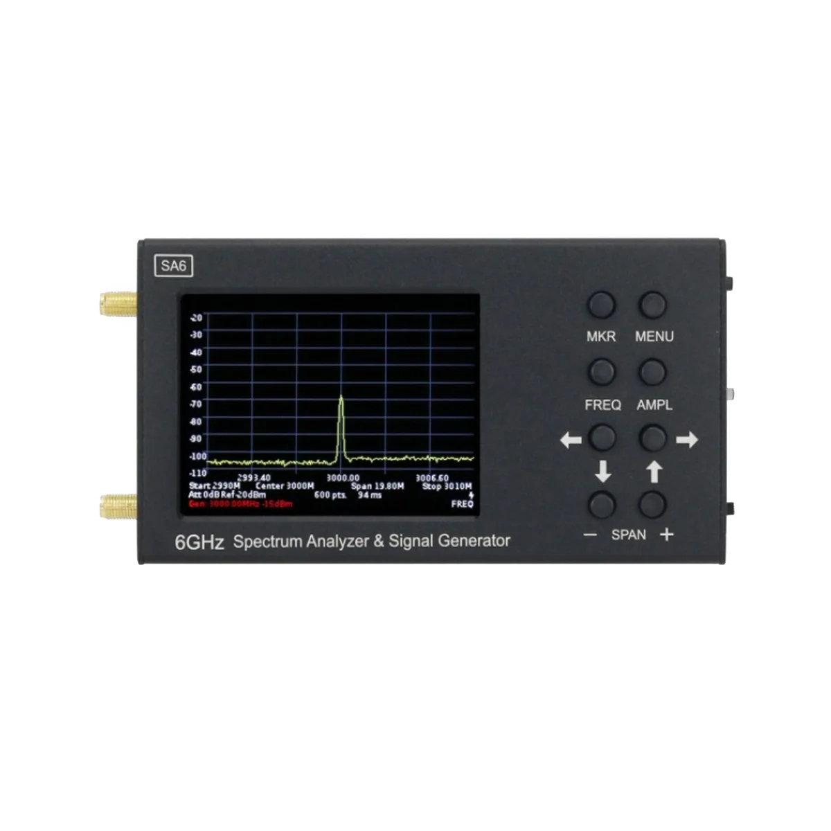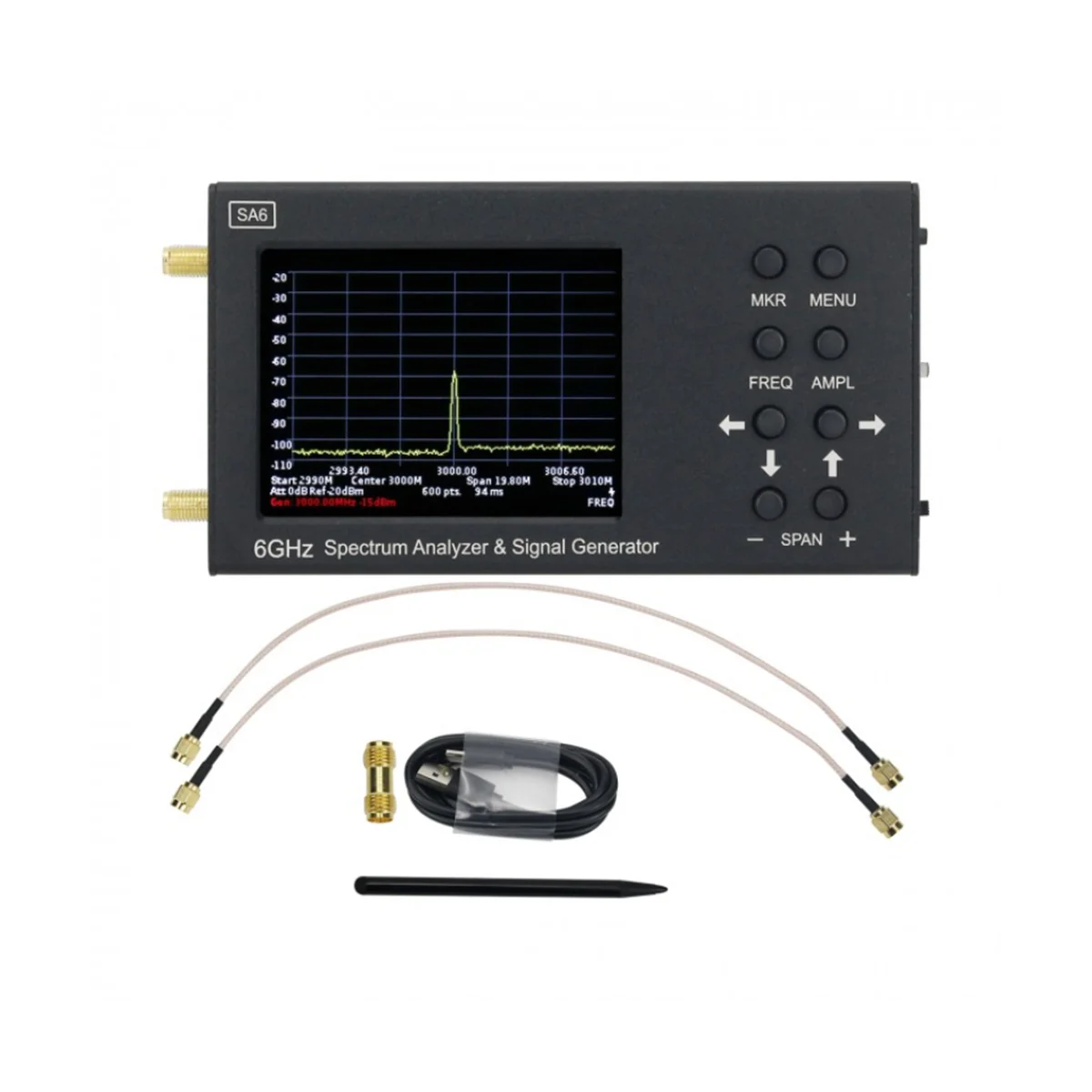 SA6 es un simple analizador de espectro portátil y fuente de señal diseñada para mostrar el espectro de señal de 35 a 6200 MHz. El analizador encuentra la amplitud y la frecuencia de los componentes espectrales del proceso analizado. El analizador de espectro puede procesar señales de todas las tecnologías ampliamente utilizadas: Wi-Fi, 2G, 3G, 4G, LTE, CDMA, DCS, GSM, GPRS, GLONASS, etc. Otra característica importante es su generador de seguimiento, que permite medir la respuesta de frecuencia de dispositivos pasivos o activos. (Como filtros o amplificadores). El software permite la medición de SWR y módulos de pérdida de retorno. Esto requiere un acoplador direccional externo y un conjunto de medidas de calibración. El SA6 se utiliza principalmente para la operación in situ. El equipo es resistente y duradero, ligero y de bajo consumo de energía. Permite a los centros de servicio y a los equipos de mantenimiento realizar análisis de HF in situ para los trabajos de puesta en marcha y reparación. Además, el analizador de espectro es la solución perfecta para talleres de reparación y entusiastas de la radio. Por ejemplo, puede usar el dispositivo para hacer lo siguiente: coloque la antena externa en la estación base. Análisis rápido del entorno RF. Compruebe el correcto funcionamiento de la celda de relé. Reparación y ajuste de repetidores, generadores, filtros, etc. Medición de SWR al usar un acoplador direccional externo Se puede controlar a través de los botones del dispositivo o la pantalla táctil. Transmisión de datos entre el analizador y el PC a través de cable USB. Todos los datos de medición se muestran en la pantalla del dispositivo o PC en tiempo real. Pantalla táctil resistiva a color de 3,2 pulgadas Amplio rango de frecuencia: 35 a 6200MHz Barrido rápido del rango de frecuencia: 500 puntos por punto Alta precisión de medición: 2dB dentro de 70-75dB de rango dinámico. Compatibilidad de ordenadores basados en Windows. Un dispositivo se puede utilizar con la ayuda de un PC. La fuente de alimentación independiente puede durar hasta 4 horas de funcionamiento ininterrumpido. Y la transmisión de datos por cable a un PC Rango de frecuencia de pantalla: 35-6200 MHz Rango de frecuencia de medición: 35-4500 MHz Rango dinámico de 35-3000 MHz: rango dinámico de 75 dB de 3000-4500 MHz: 70 dB Alcance máximo: 6165 MHz Ancho de banda: 200 kHz, fijo Ver la velocidad de escaneo de la banda de frecuencia por encima de 100MHz: 700MHz/seg Color: negro Material: aleación de aluminio Contenido del paquete: 1 x Host del analizador de espectro 1 x lápiz táctil resistivo 1 x Cable USB 2 x Cable de extensión SMA de 30CM/11,8 pulgadas 1 x Pasado por el SMA-KK 1 x Manual de usuario chino-inglés Solo el contenido del paquete anterior, otros productos no están incluidos. Nota: El reflejo de la luz y las diferentes pantallas pueden hacer que el color del elemento en la imagen sea un poco diferente del real. El error de medición permitido es +/- 1-3cm.