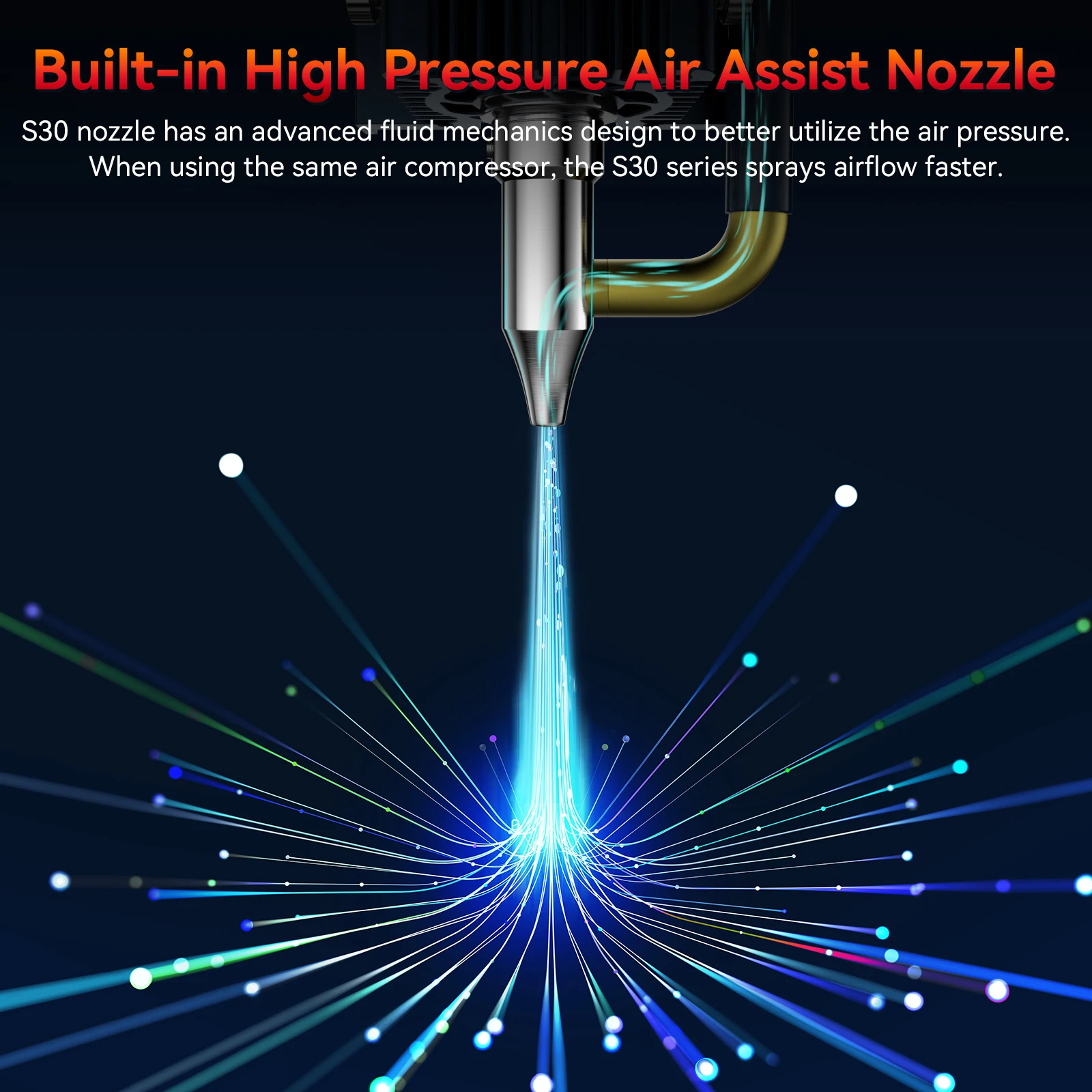 ▶  Built-in high pressure air assist nozzle: S30 series is equipped with advanced high-pressure air-assisted metal nozzle, which can generate high-pressure airflow under the air pump, greatly improving the cutting efficiency, and the cutting speed is more than 5 times faster than that without air assistance. The powerful airflow blows away the residue, making the cut surface very clean.