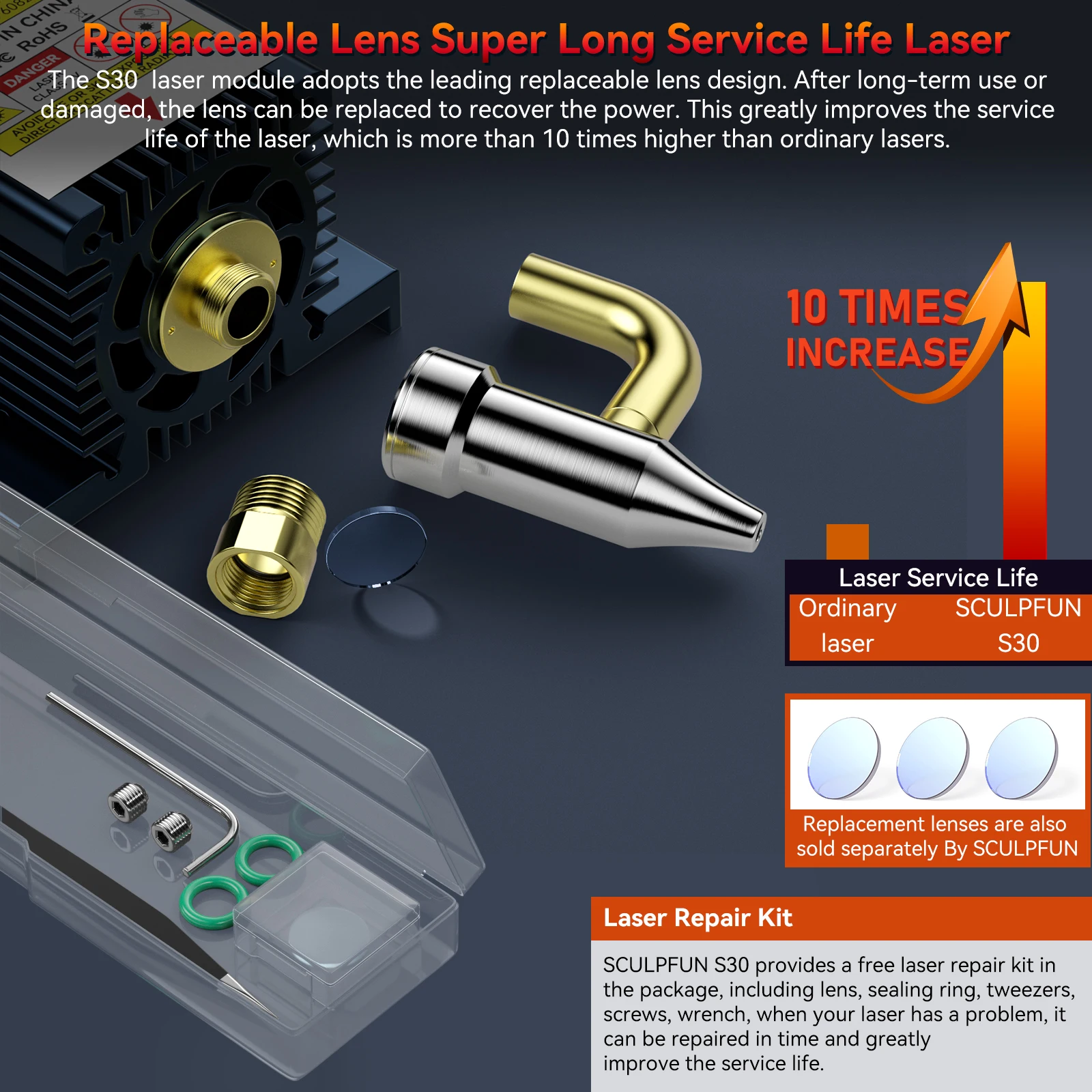 ▶  Replaceable protective lens: Adopts innovative replaceable lens, greatly improves the service life of the laser, which is more than 10 times longer than other general lasers. When the lens is damaged or after long-term use, the lens can be replaced to restore the cutting power. A free lens is included with the purchase, more lens can be easily purchased from SCULPFUN.