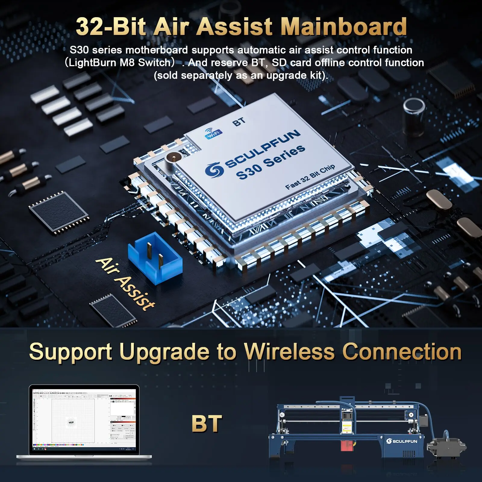 ▶  Upgraded Laser Engraving with Air Assist System: The S30 series is equipped with an airassist 32-bit motherboard and a control-type air pump, which can intelligently control the air-assist switch during engraving through the LightBurn software M8 button, this makes the engraving and cutting very clean, and is very suitable for the manufacture of exquisite gifts.