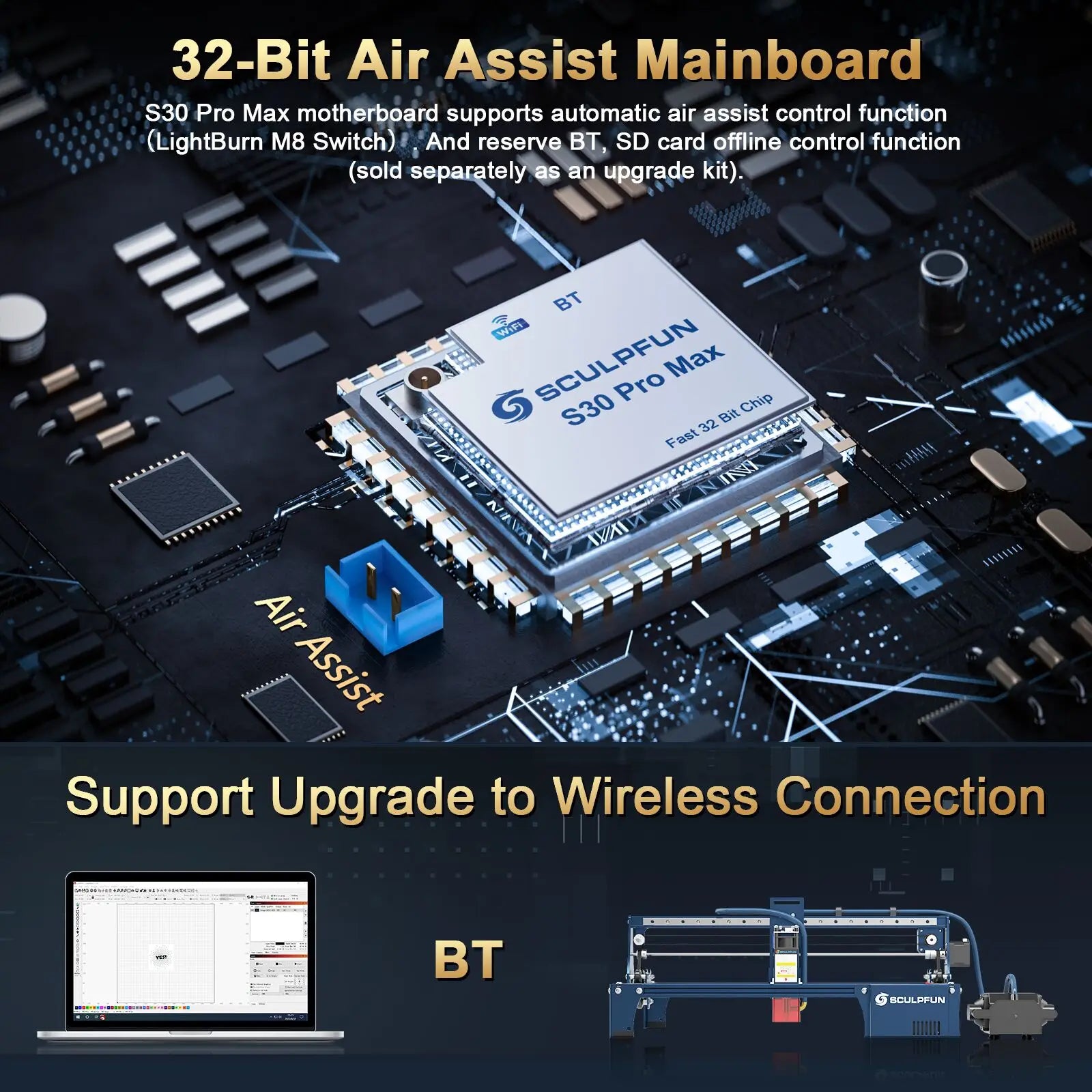 ▶ Upgraded Laser Engraving with Air Assist System: The S30 series is equipped with an airassist 32-bit motherboard and a control-type air pump, which can intelligently control the air-assist switch during engraving through the LightBurn software M8 button, this makes the engraving and cutting very clean, and is very suitable for the manufacture of exquisite gifts.