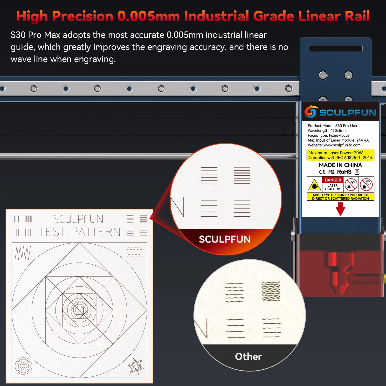 ▶ Excellent Engraving Performance: S30 PRO MAX 20W laser pursues the ultimate cutting speed, suitable for professionals, shops or factory; It can cut 15mm balsa wood and 10cm plywood at one time. And making it reach industrial-grade engraving accuracy with extremely solid and high-precision linear slide rail X-axis, no e wavy pattern in carving small items. 410*400mm large-area engraving range can meet your various engraving needs.