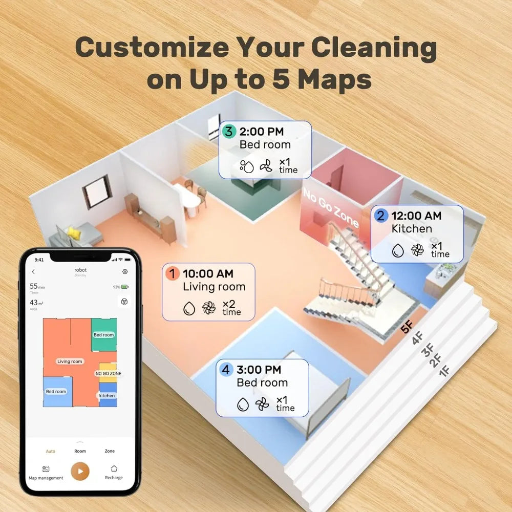 - 【4-in-1 Vacuum and Mop Combo】This vacuum robot supports vacuums only, mops only, and vacuums and mops at the same time. It has a 2-in-1 integrated water tank that consists of a 3L dust bag and a 200ml water tank, vacuuming and mopping can be done in one go without replacing the dustbin and water tank, effectively reduces the cleaning time by 40%. It aslo includes cleaning hose, attach the nozzle, and it becomes a portable handheld vacuum.