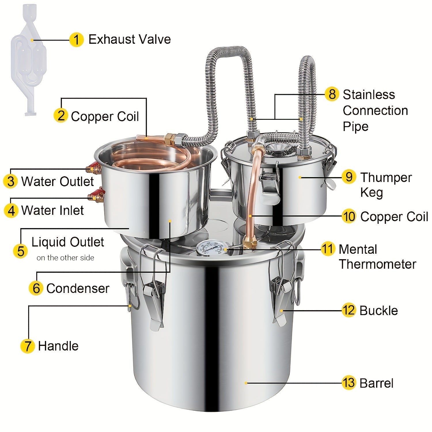 Set, Alcohol Still, 3 Gallon, Stainless Steel Alcohol Distiller With Copper Tube & Build-in Thermometer & Water Pump, Double Thumper Keg Home Brewing Kit, For DIY Whiskey Wine Brandy