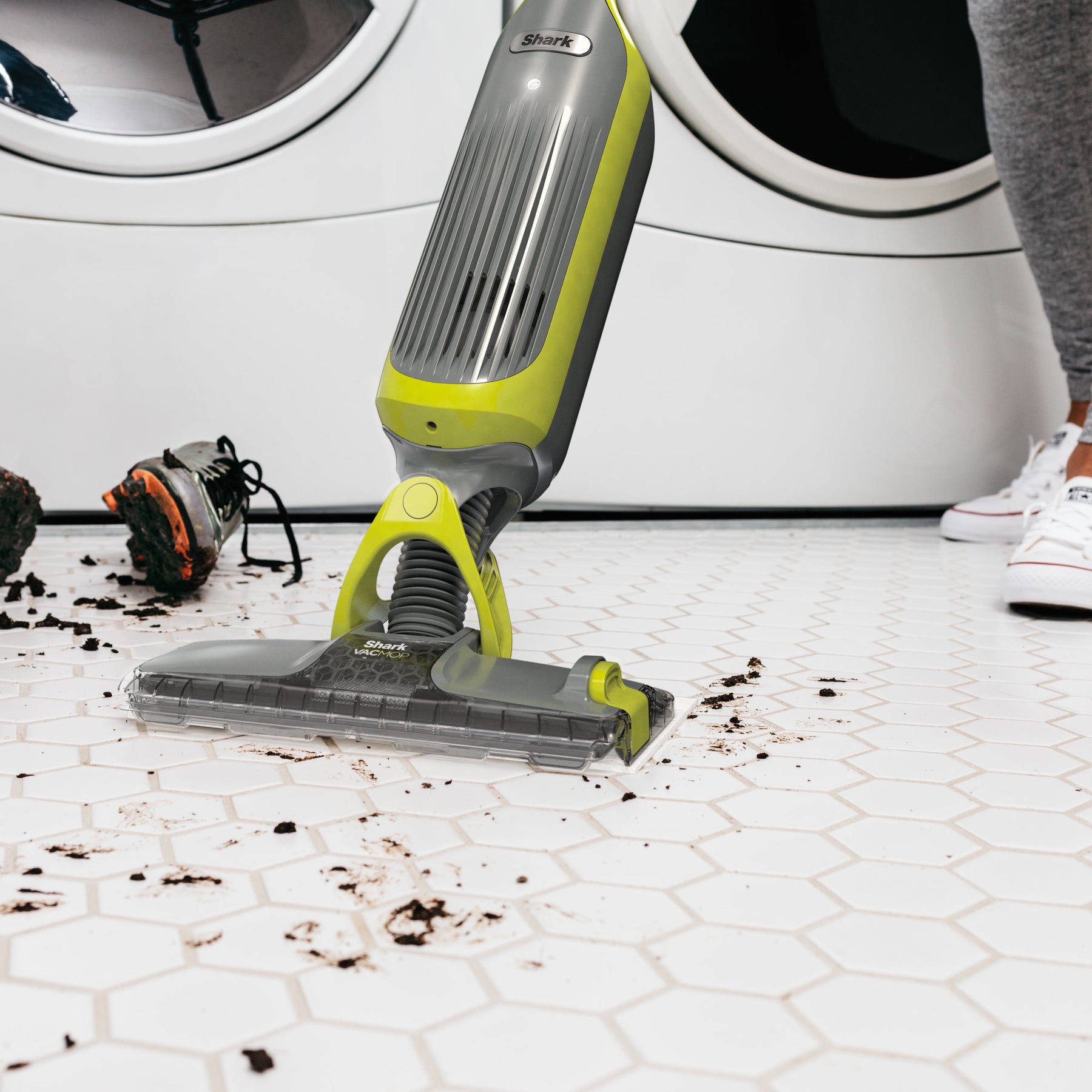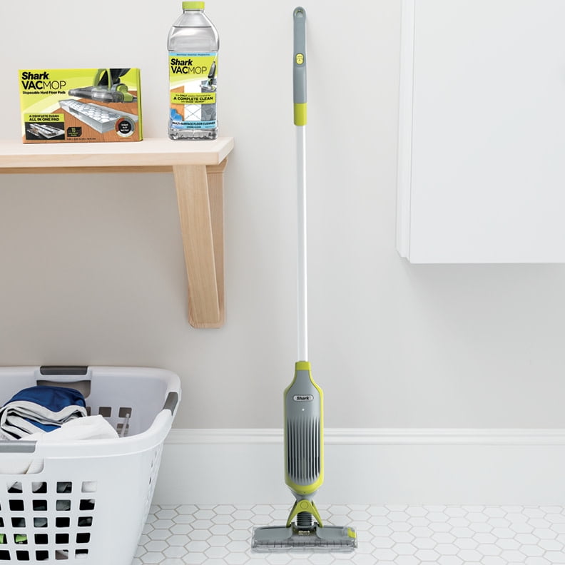 The Shark VACMOP™, VM200 combines powerful suction & spray mopping in one disposable pad. Vacuum dry debris, scrub wet messes, & toss the pad. Includes cordless charging, 2 disposable pads, and a 12-oz. bottle of VACMOP™ multi-surface hard floor cleaner.