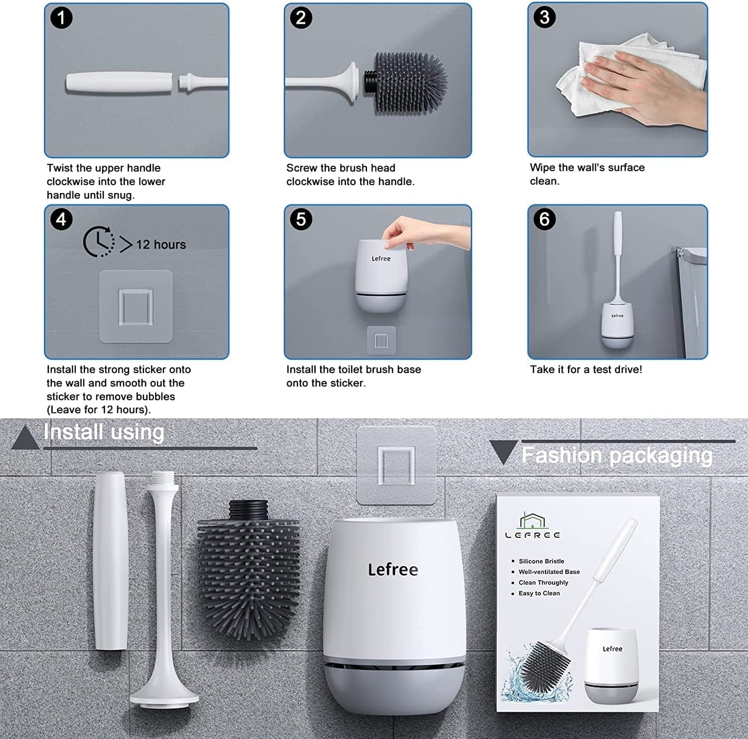 - Easy to install - Easy to put together. You can set the toilet scrubber on the wall with a sticker or place it on the floor as a freestanding toilet bowl brush.