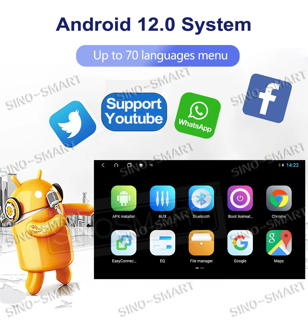 In WIFI/4G network, GPS, support Steering wheel control buttons, Bluetooth for phone call/music and Bluetooth OBD, 1080P video play, Mirror link with iPhone/Android. Download and install the APP you like.