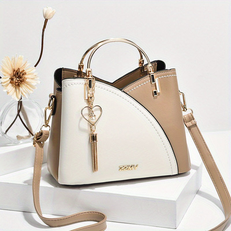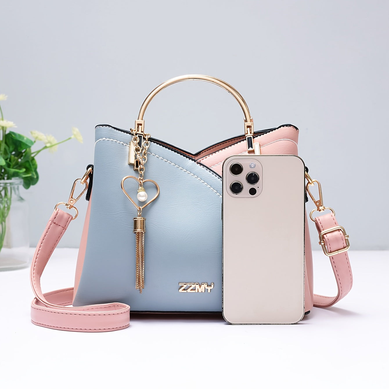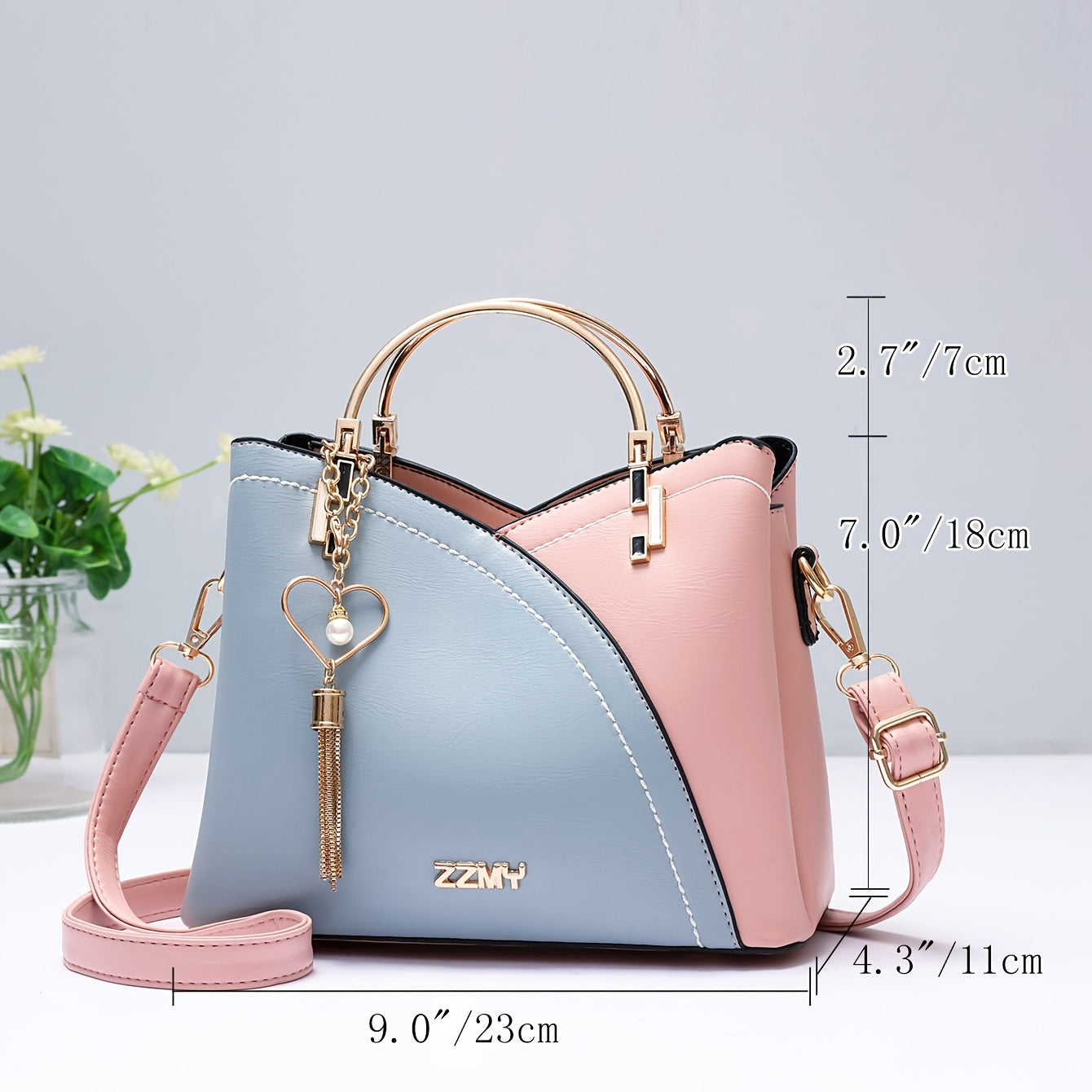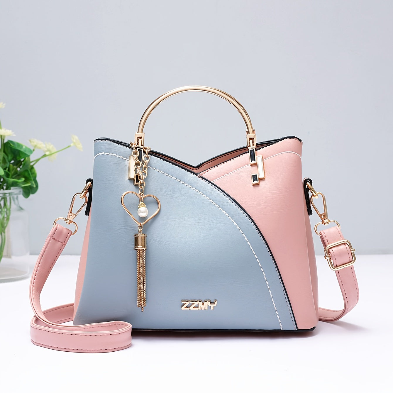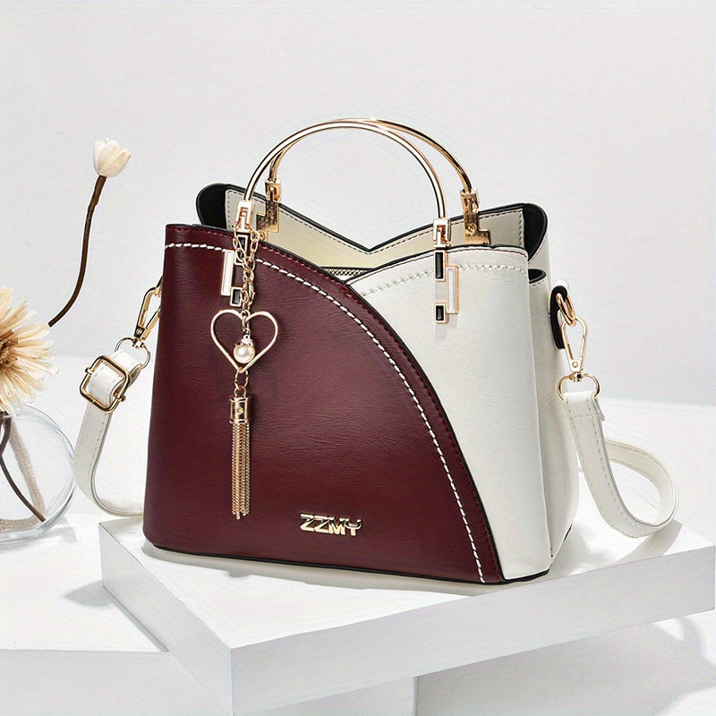 Small Two Tone Handbag, Fashion Tassel Decor Crossbody Bag, Women's Top Ring PU Leather Purse