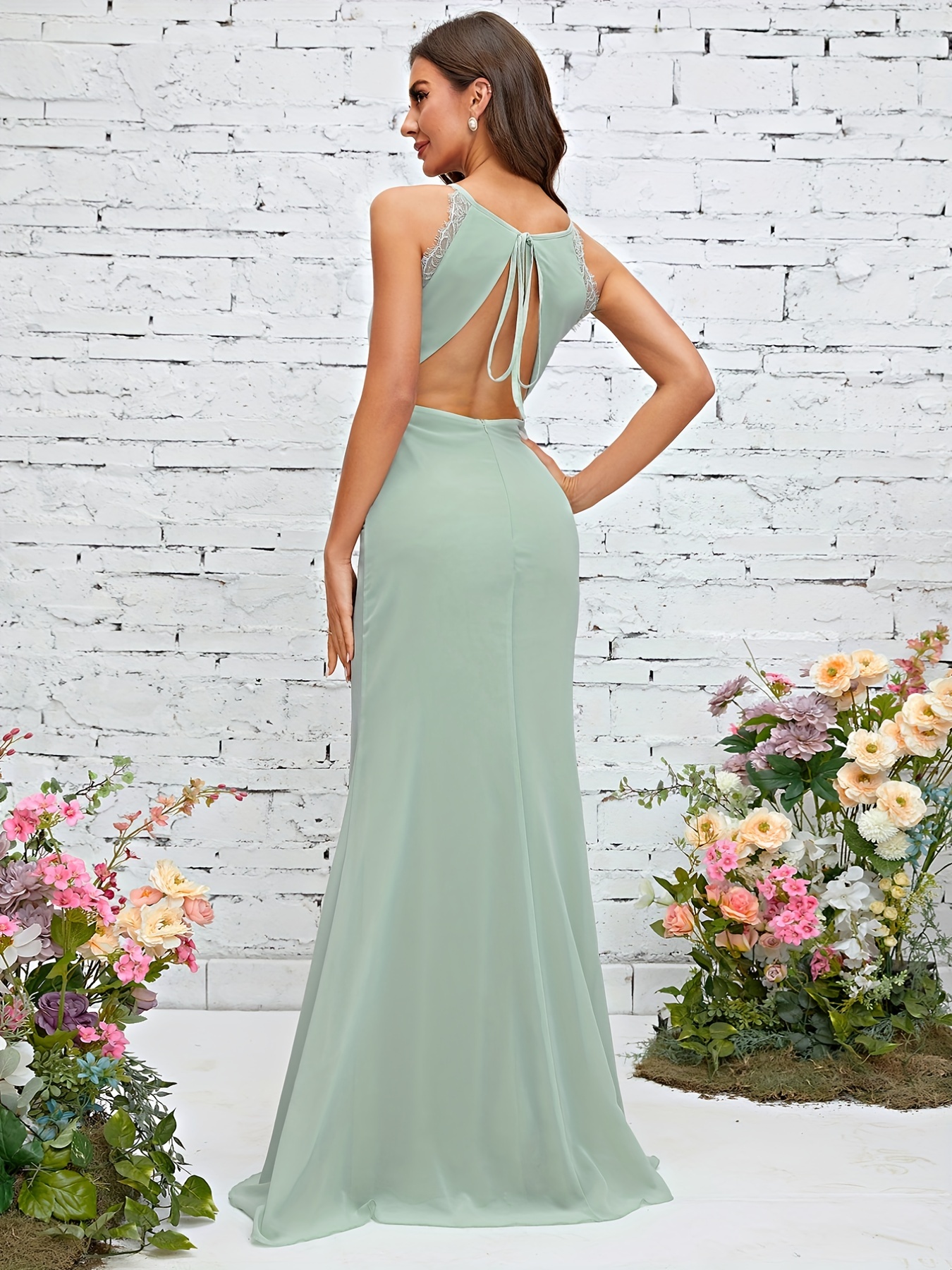 Solid Contrast Lace Dress, Elegant Sleeveless Tie Back Split Dress, Women's Clothing