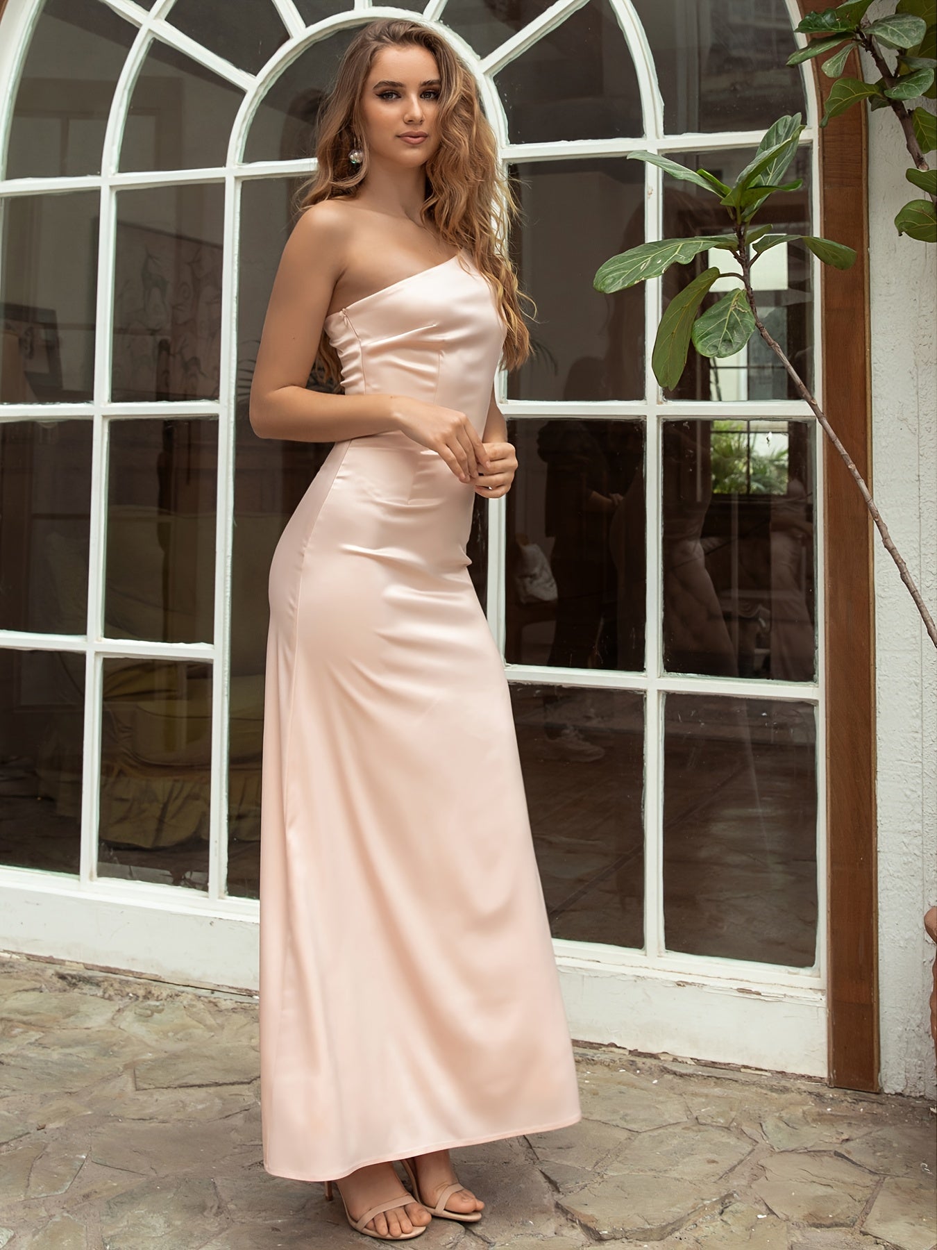 Spaghetti Strap One Shoulder Long Solid Satin Dress, Elegant Party Guest Gown Dress, Women's Clothing