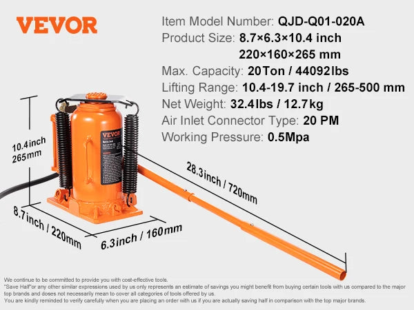 The SucceBuy air hydraulic bottle jack is engineered to conquer the toughest lifting jobs with minimal effort. Boasting a robust 20-ton capacity and an adjustable height range from 10.4" to 19.7", it adapts seamlessly to various lifting scenarios. The integrated safety valve system enhances reliability and ensures secure operation. Its compact design allows for easy storage in your vehicle, making it a dependable companion for unexpected situations.
