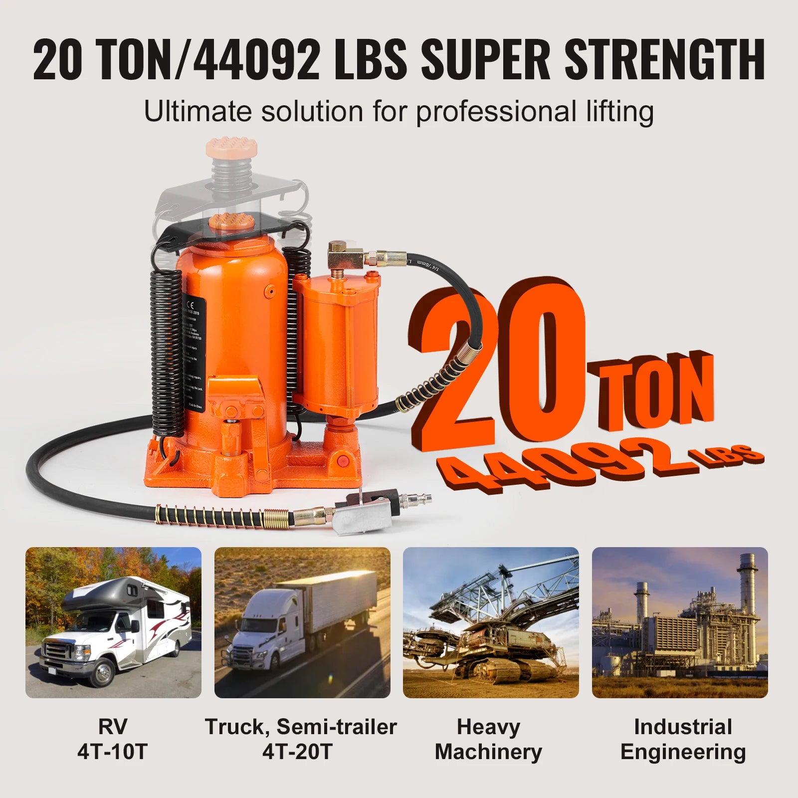 This versatile hydraulic and pneumatic bottle jack is your go-to tool for lifting heavy machinery, large trucks, and more, effortlessly managing loads up to 20 tons (44,092 lbs). It's engineered for professional-grade performance in even the toughest lifting operations..