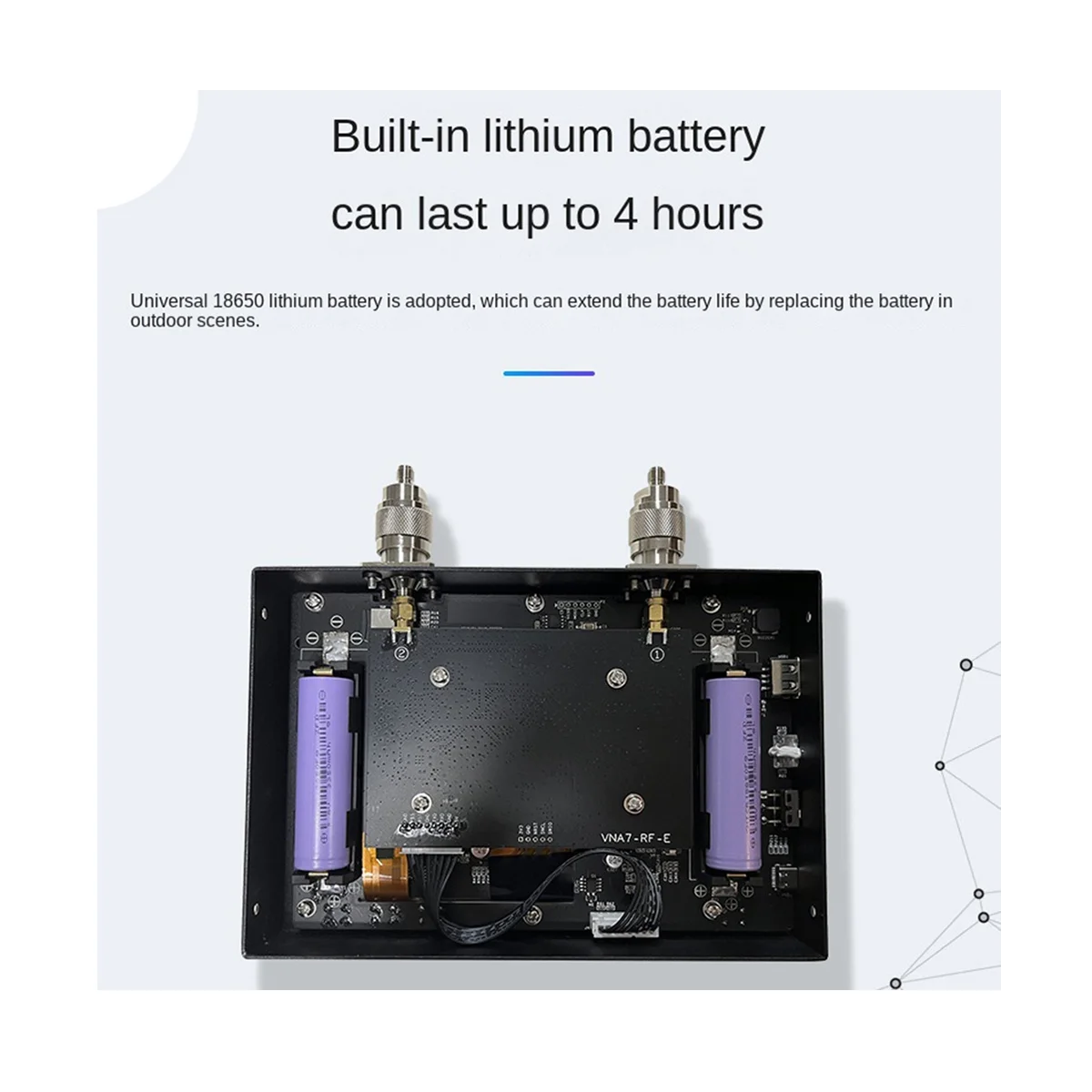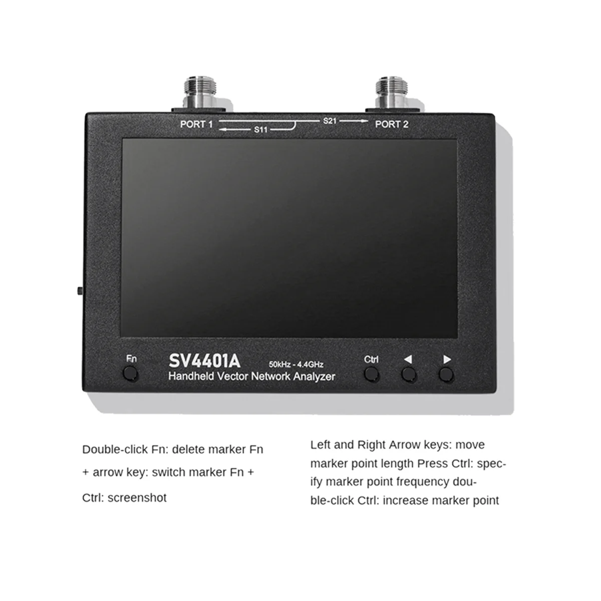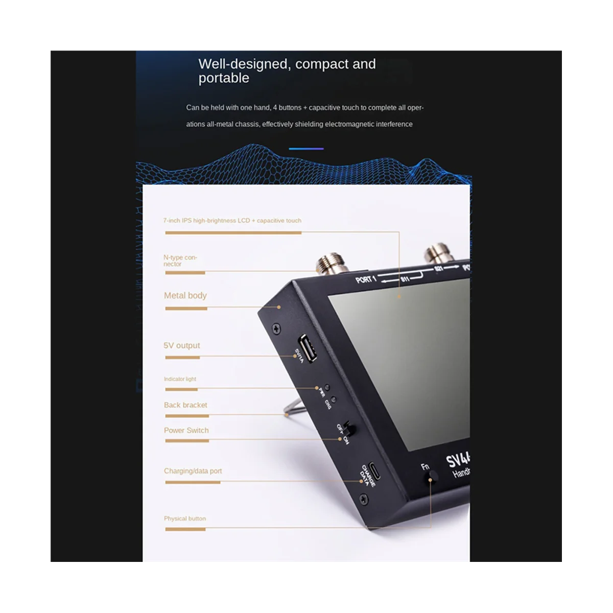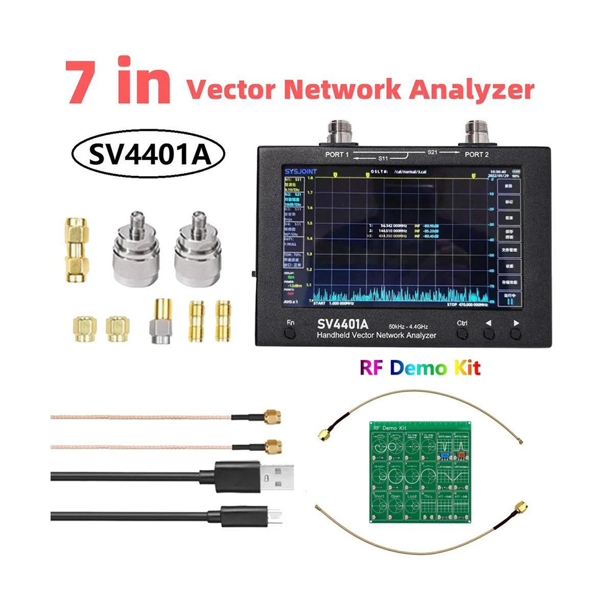 7-inch IPS bright LCD screen, capacitive touch control 100dB dynamic range: Well-designed RF front-end circuitry has an optimized noise floor to accurate and reliable measurements Powered by USB Type-C interface. A 5V/2A charger is recommended Frequency range 50K-4.4GHz: Covered frequency bands include MF/LF/HF/VHF/UHF; various antennas and filters, amplifiers, attenuators, cables, duplexers, couplers, etc. can be measured 4 buttons + capacitive touch to do everything. The all-metal shell can effectively shield electromagnetic interference.Enable one-handed operation mode Ergonomic back support design Excitation power can be adjusted from -42dBm to -12dBm. Suitable for measuring the input impedance of amplifiers N type interface makes the product stable and durable. Different batches may result in different product appearances, printed text, and colors, which do not affect usage Colour:Black Material:Metal Package Contents: 1 * Vector Network Analyzer Kit
