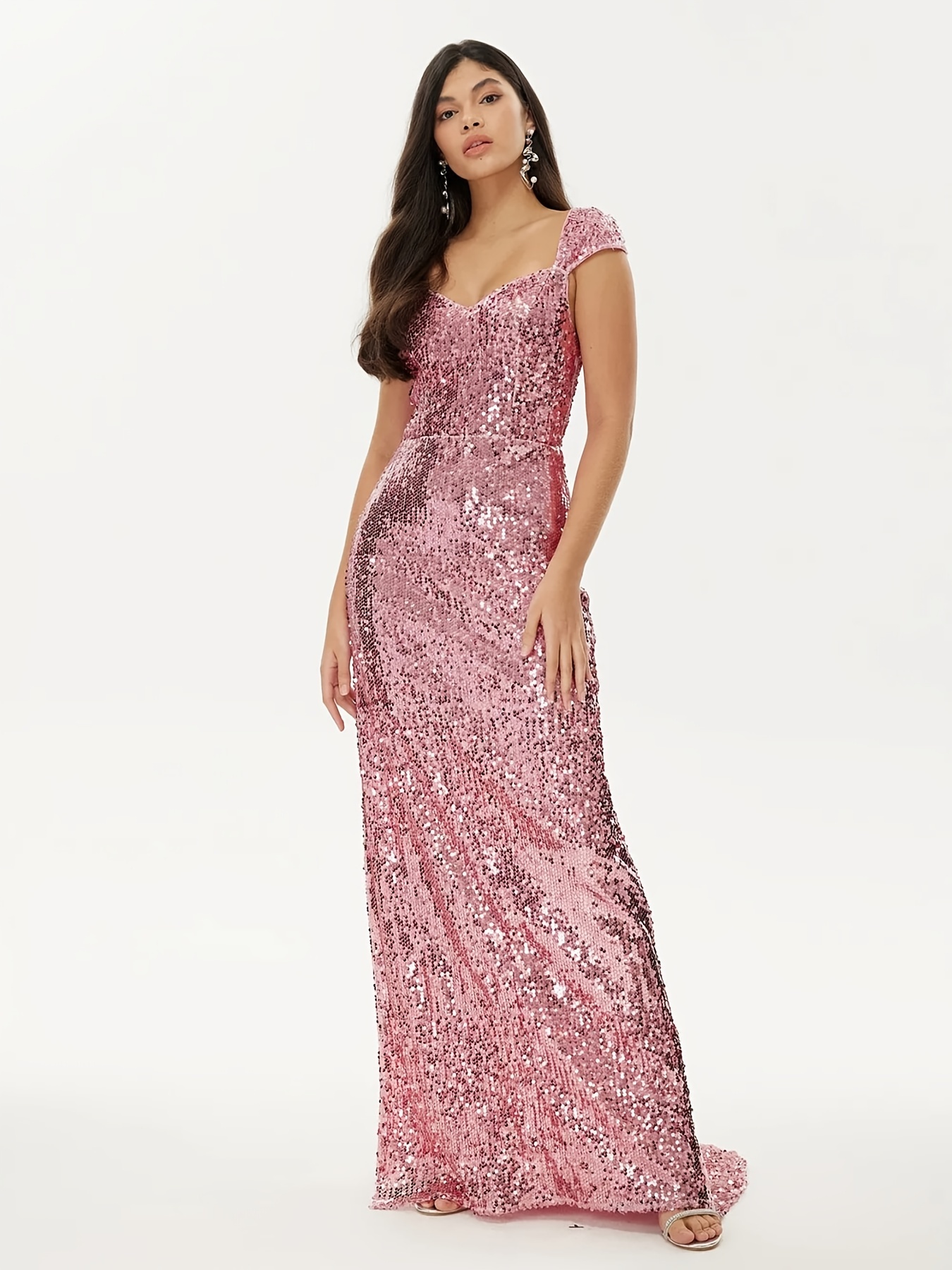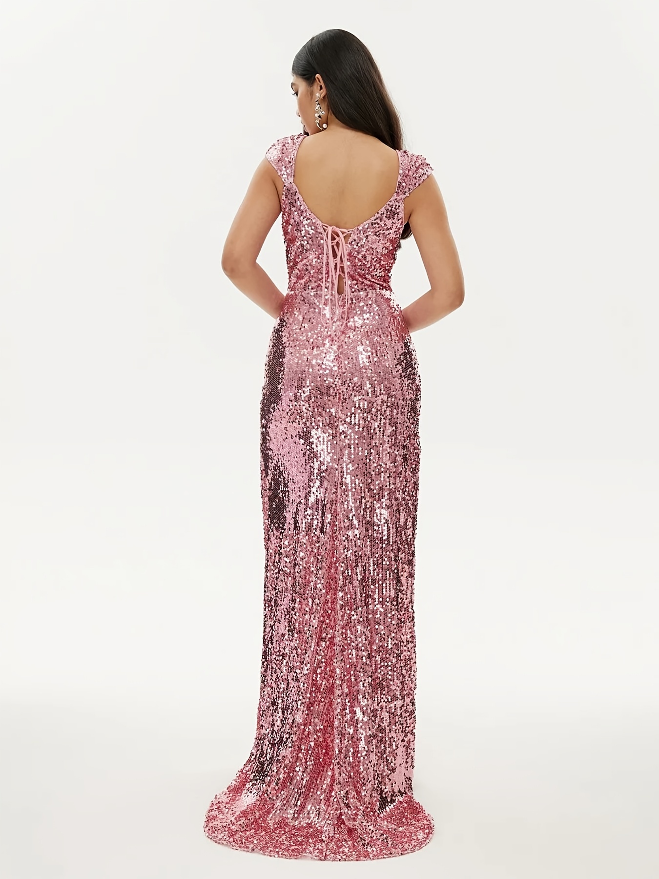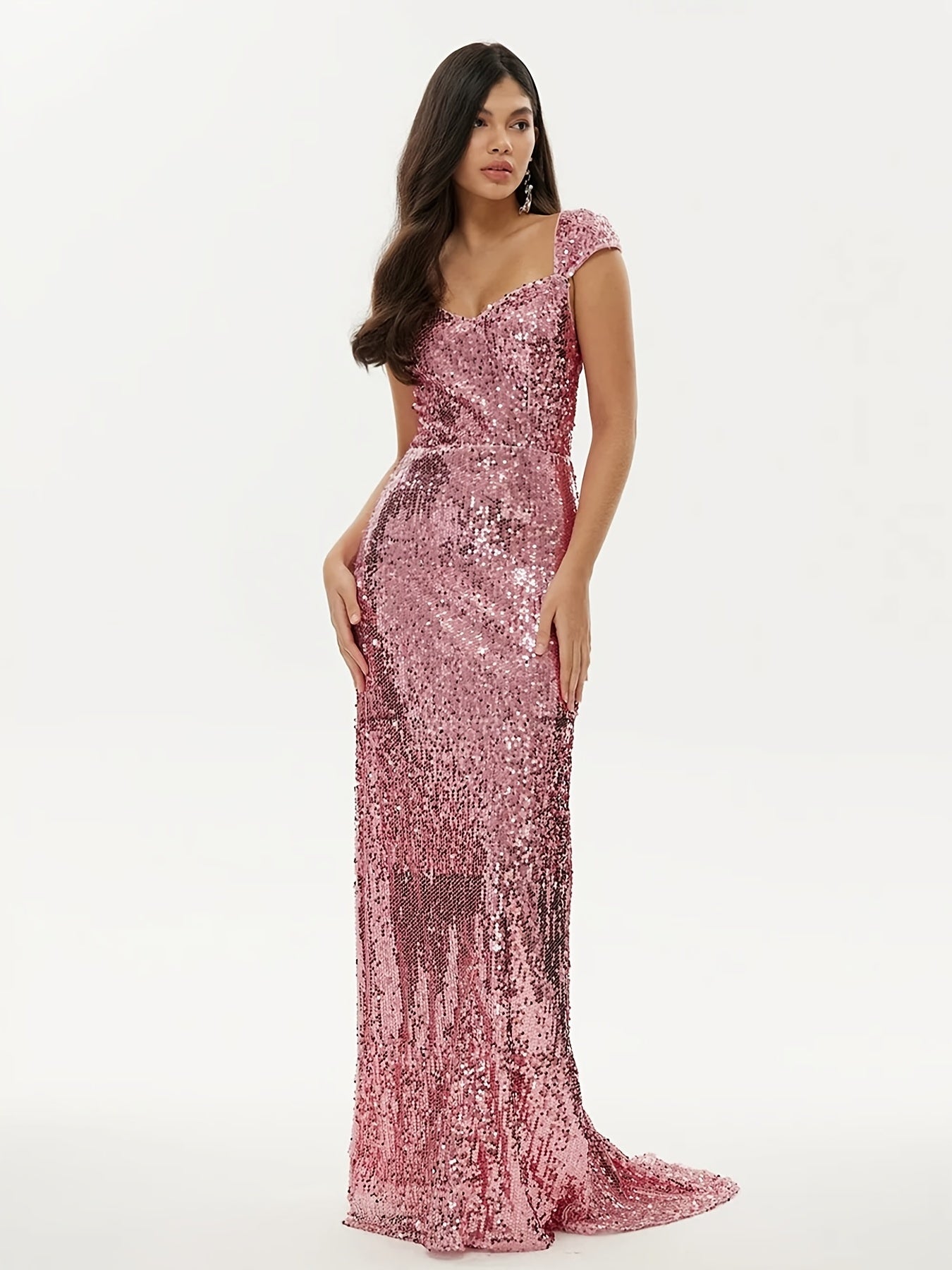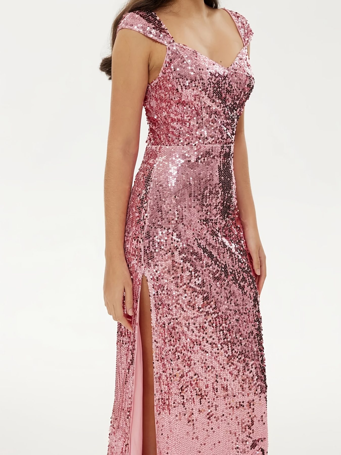 Sweetheart Neck Sequin Dress, Elegant Split Thigh Slim Maxi Dress For Party & Banquet, Women's Clothing