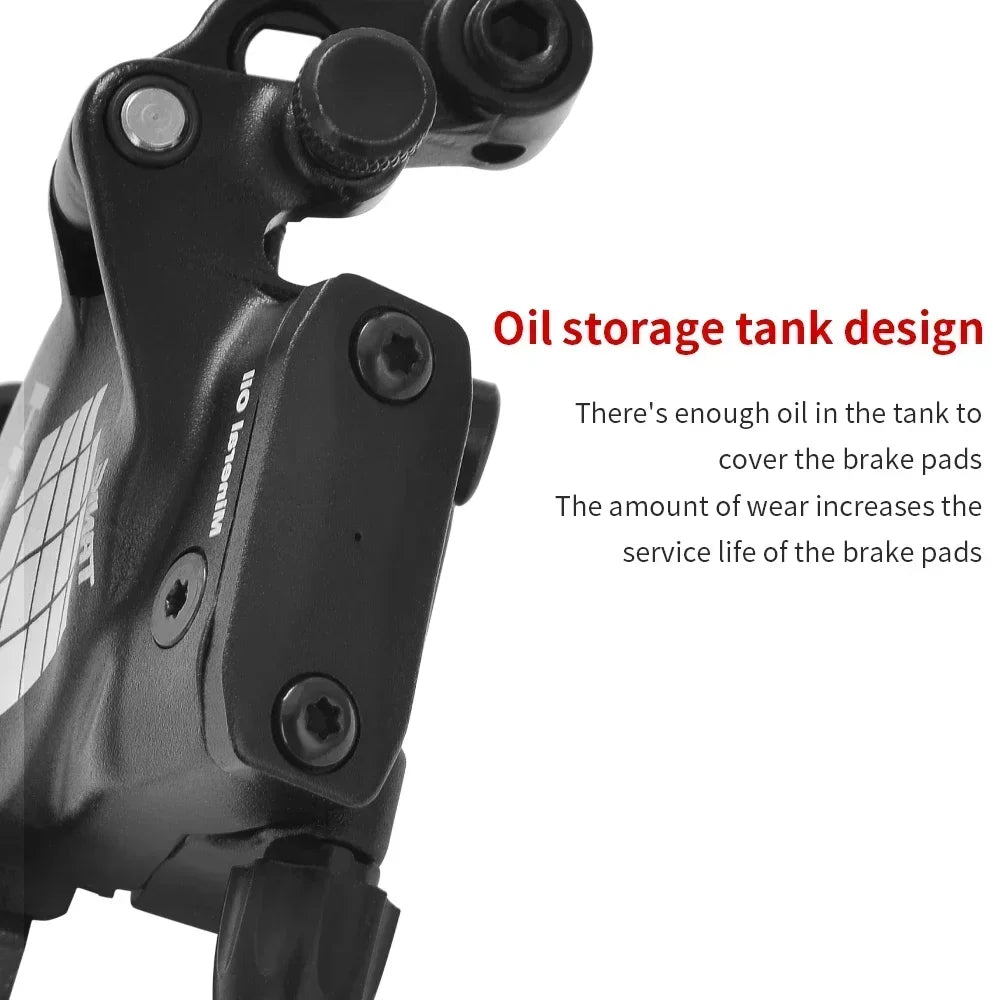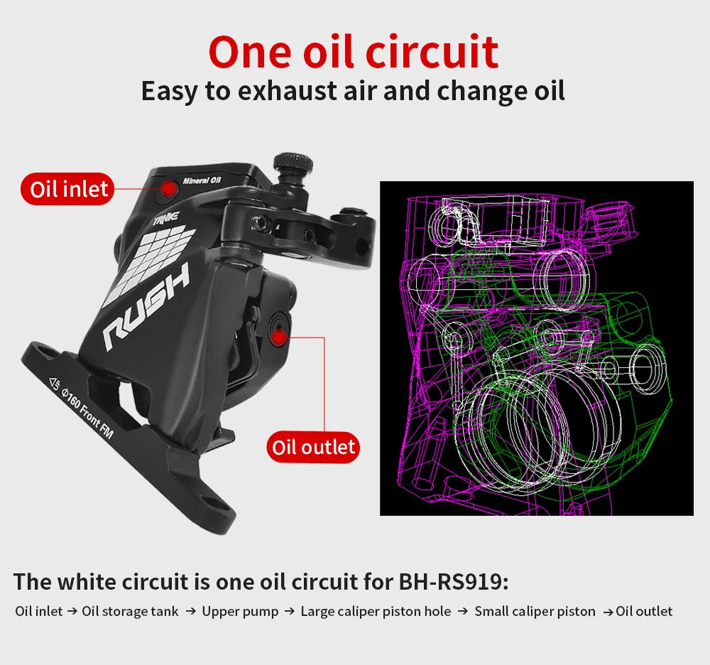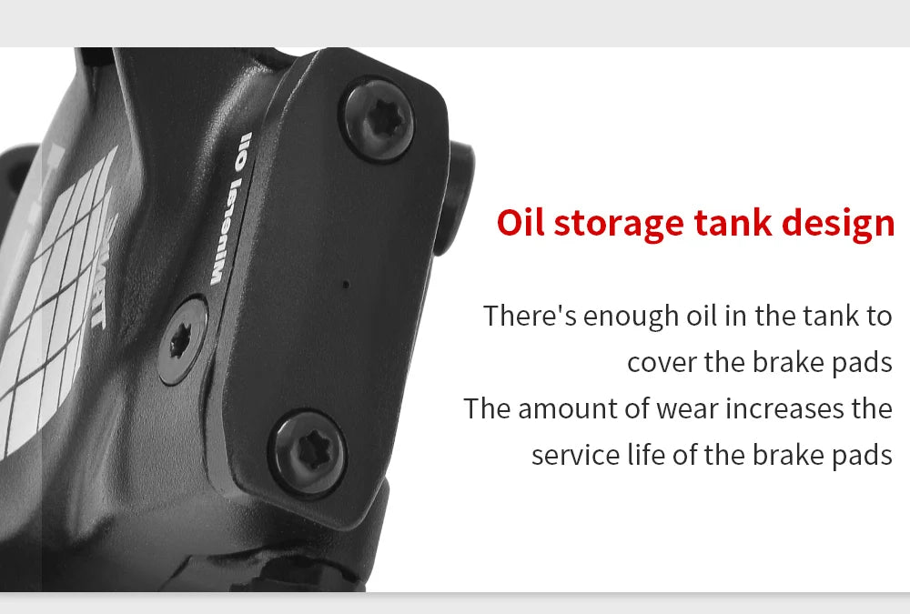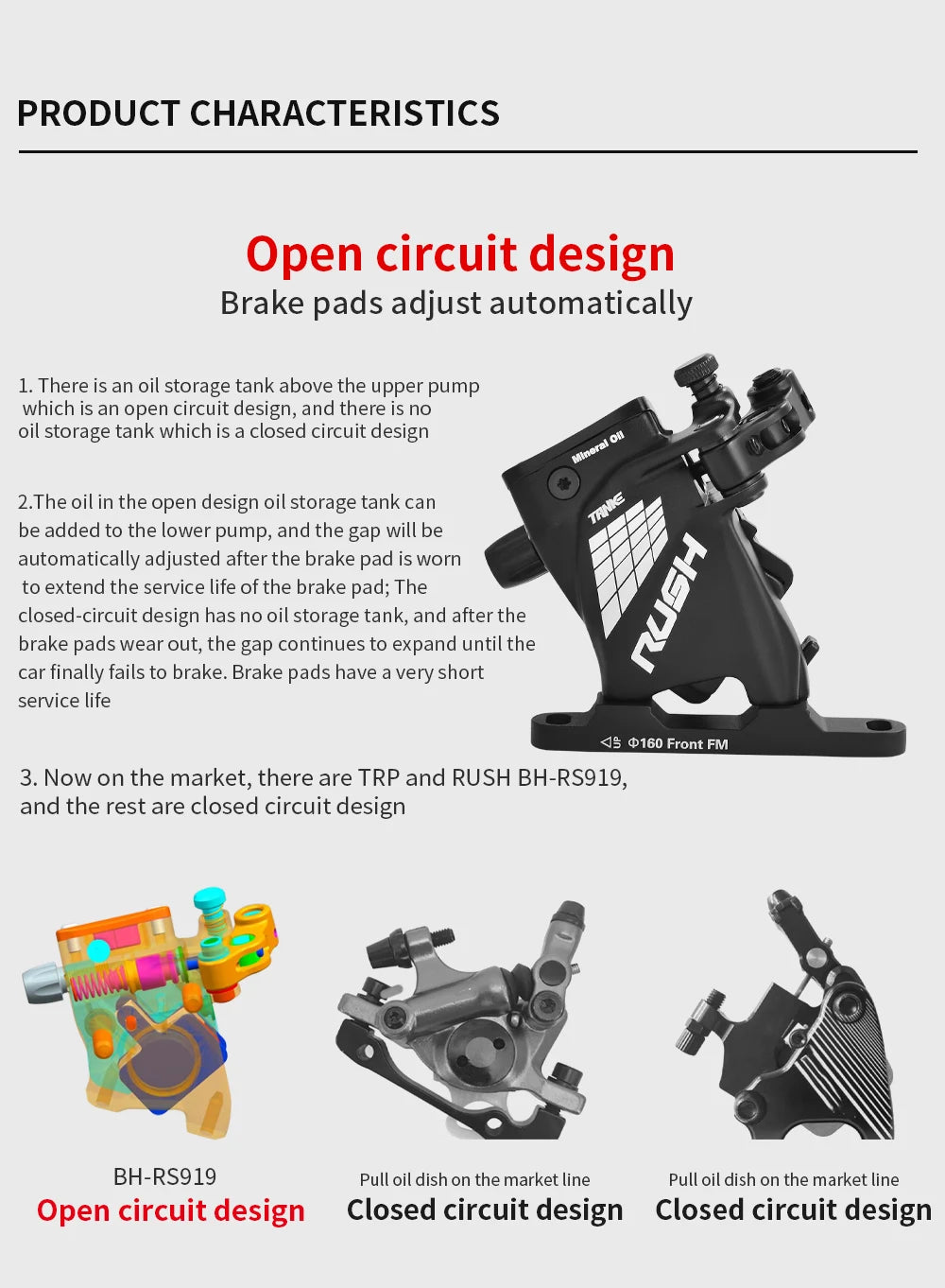 Open circuit design, oil storage tank oil enough to make up for brake pad wear, Increase the service life of brake pads1. There is an oil storage tank above the upper pump which is an open circuit design, and there is no oil storage tank which is a closed circuit design