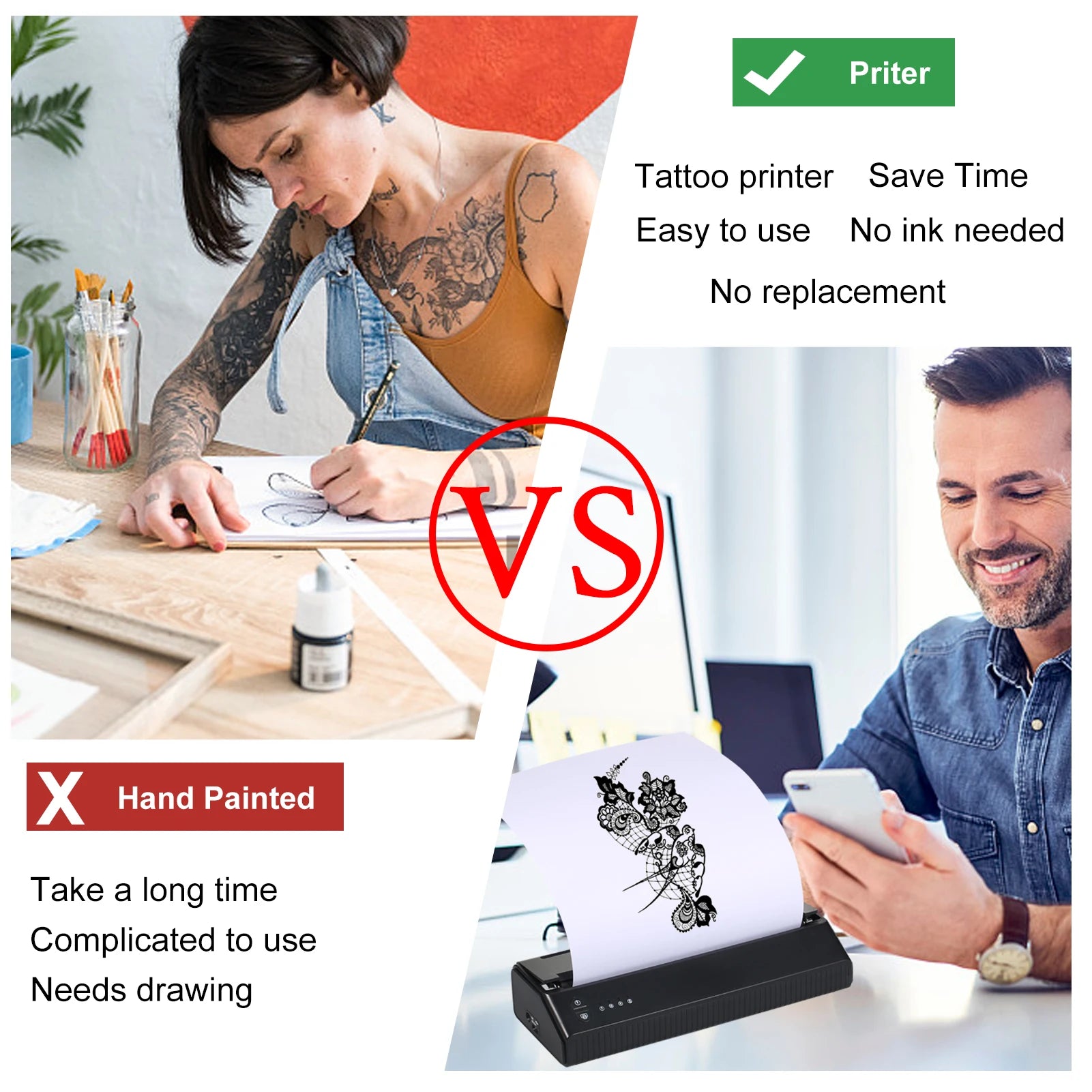 This tattoo printer has fast transfer printing speed, low heat, low noise and atable performance.