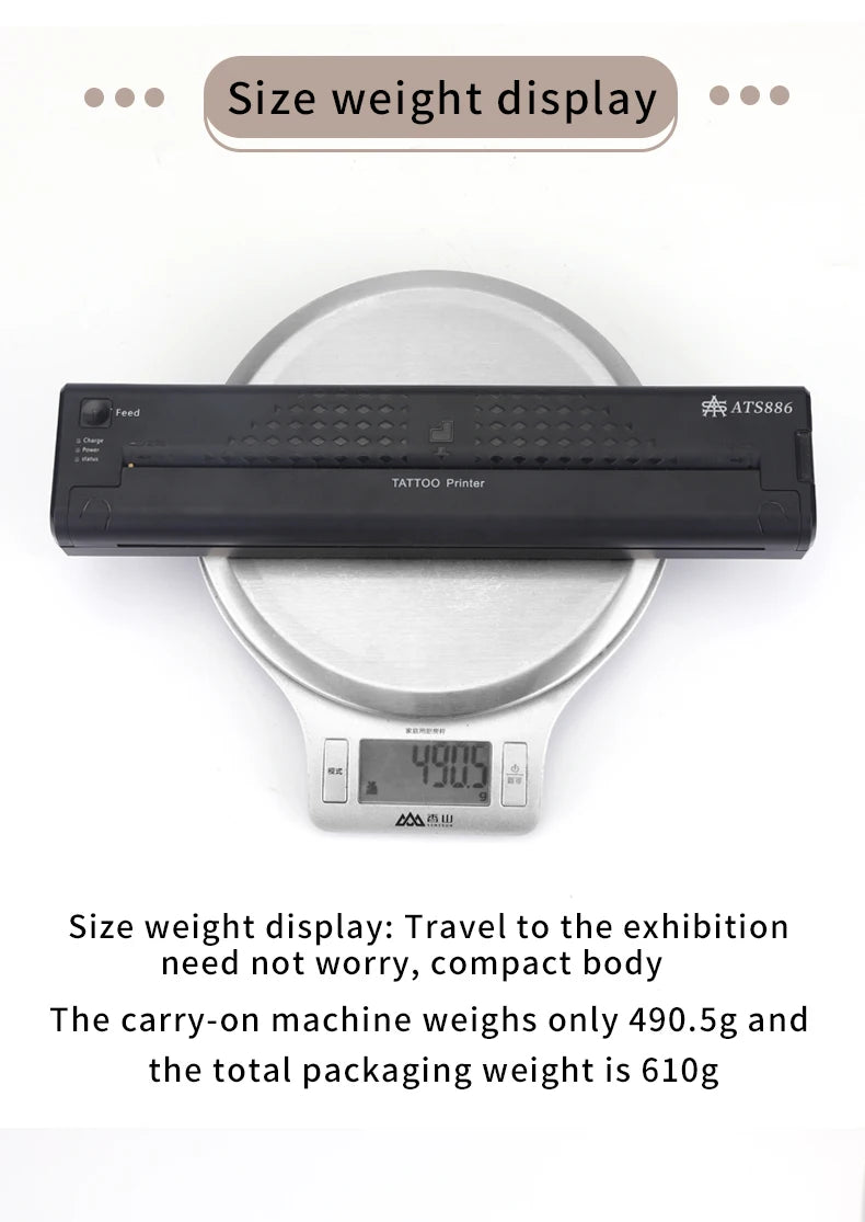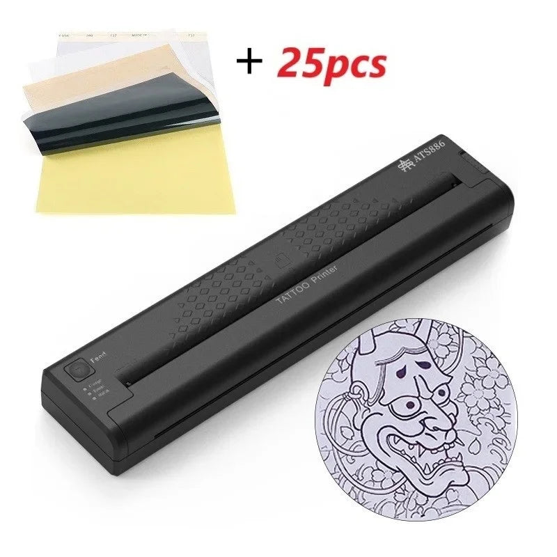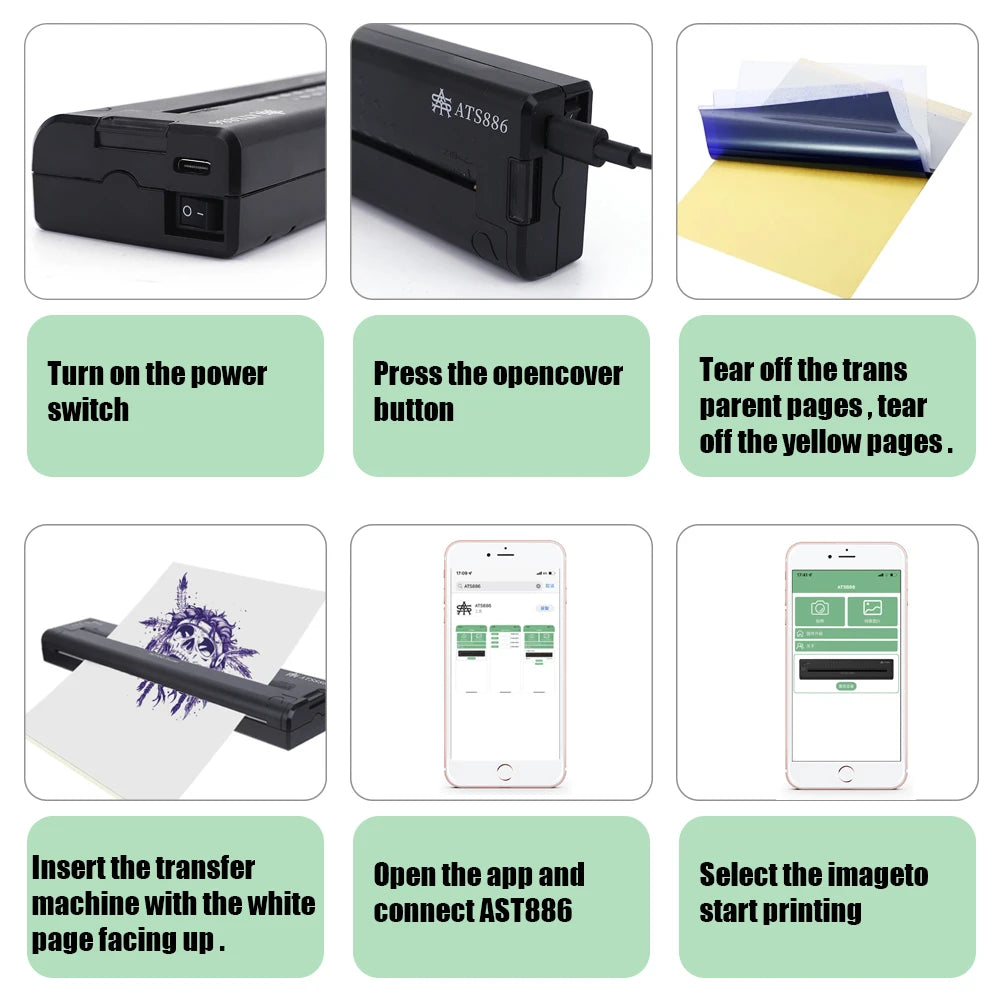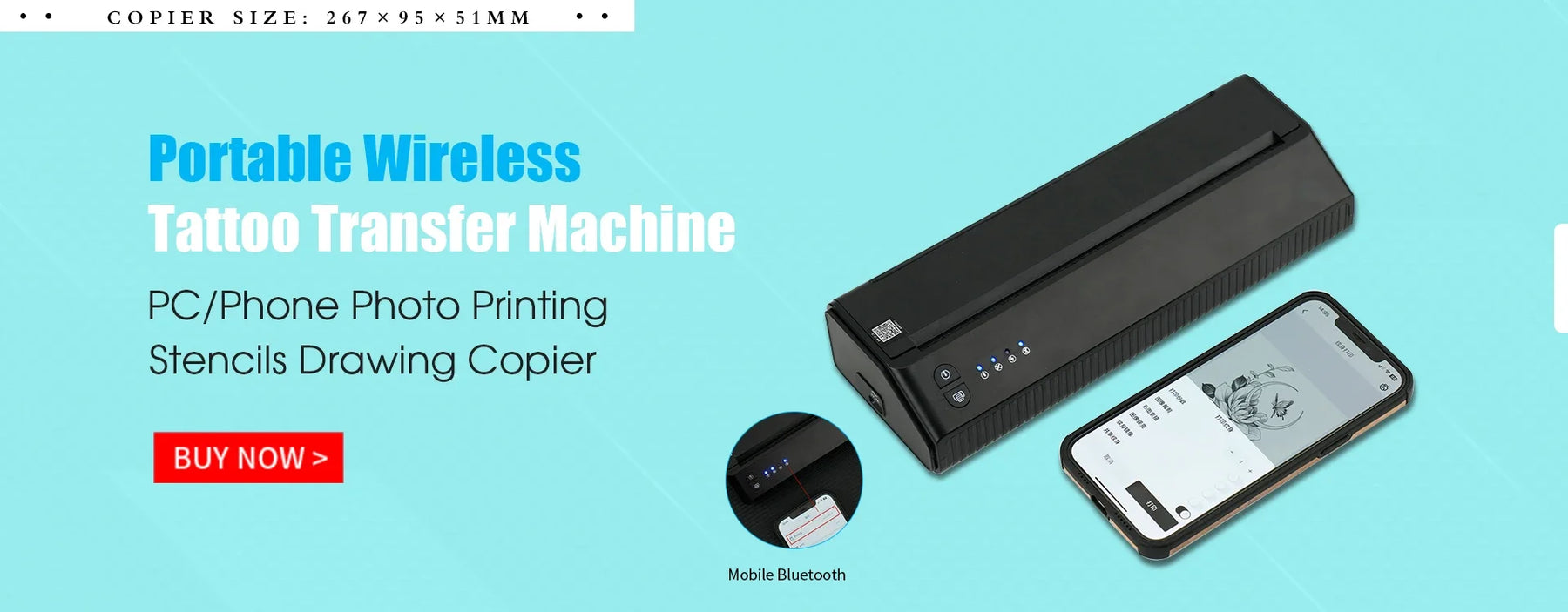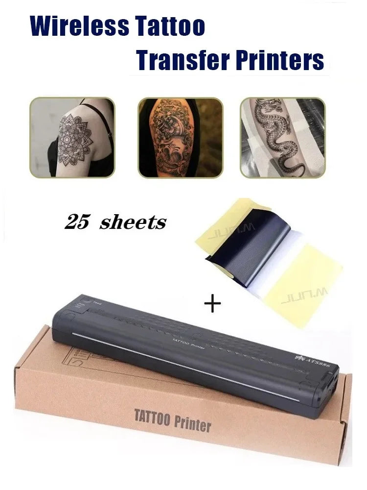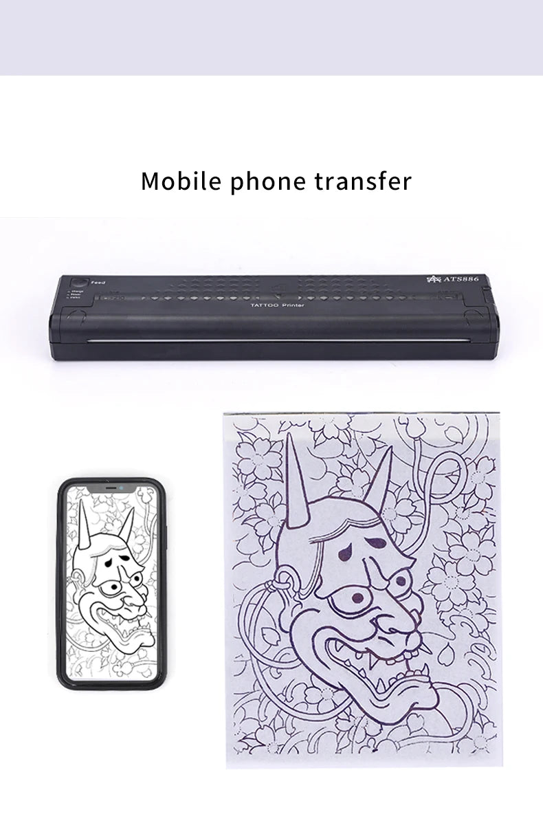 This tattoo printer can easily and quickly copy the design onto the transfer paper, the transfer is clear and beautiful, effectively keep the paper tidy, not easy to fade, easy and quick to use. Direct trawling is simple and fast, the mobile phone and tablet are directly connected to the printer's wireless network, and the wireless APP can print with one key. Support PC XP/Win7/8/10 system computers, mobile phones, PC tablet computers. (lightweight and mini, can be carried out)