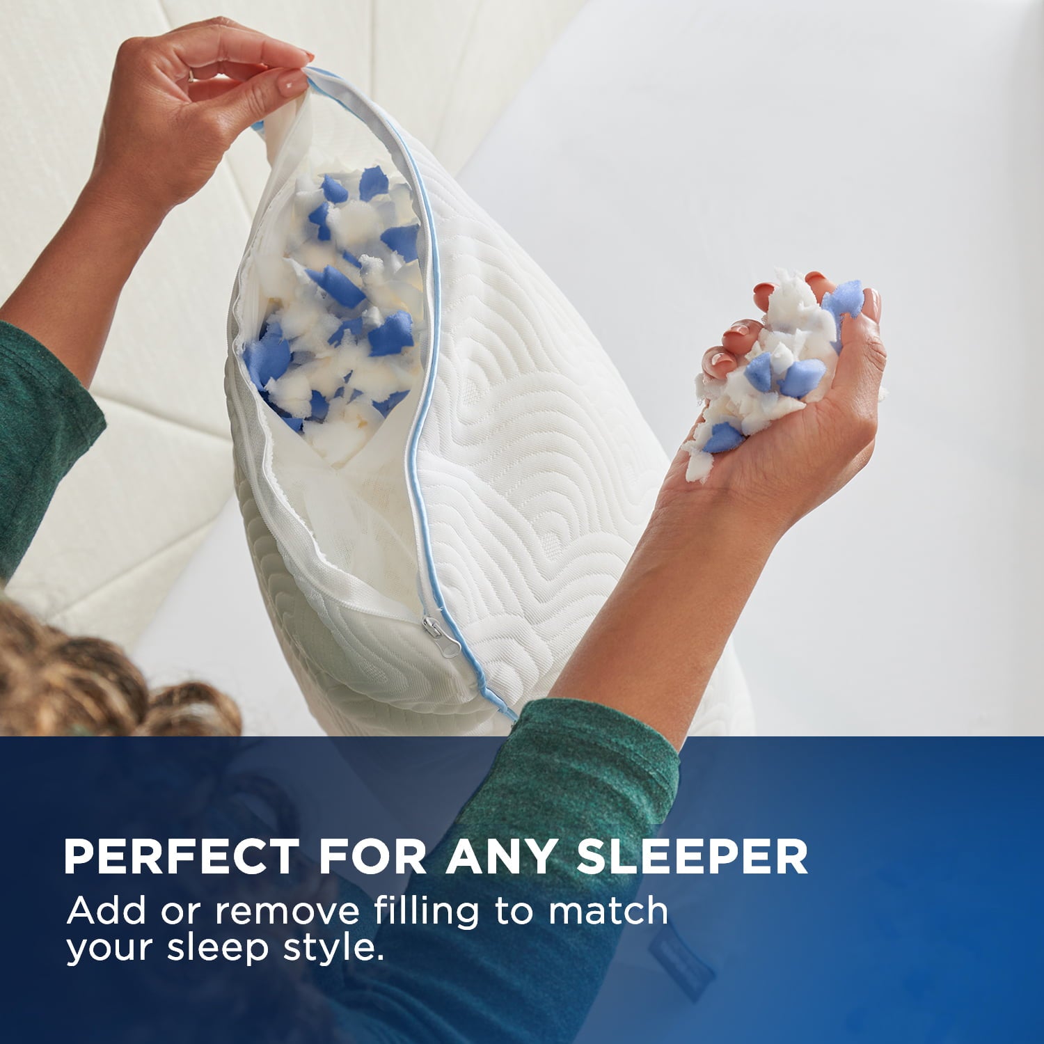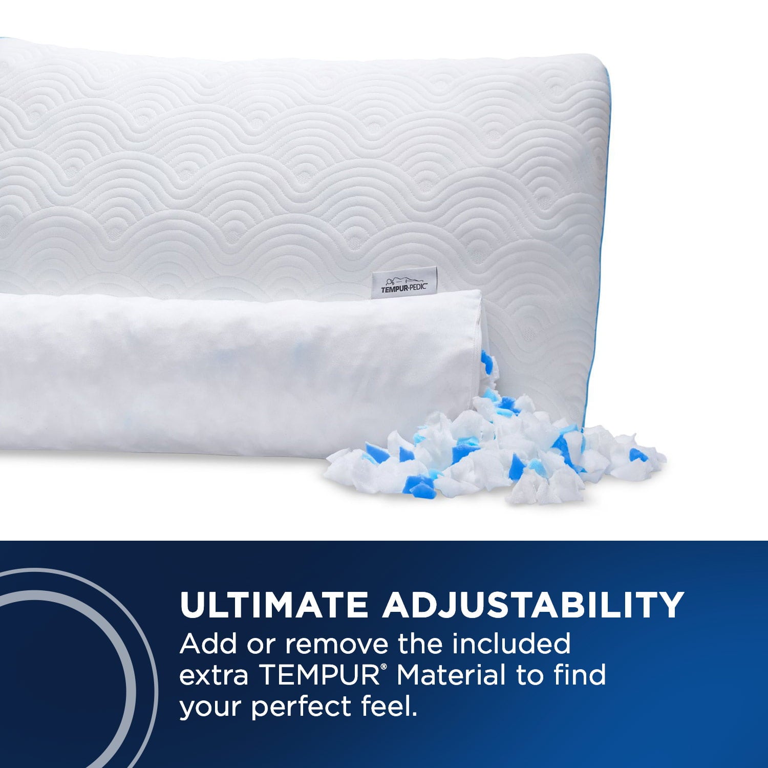 • Add or remove the Tempur-Blend Fill. Then – fluff, scrunch, flatten – repeat.. until it’s perfect for you. The unique design uses a stretchy inner layer that holds the TEMPUR-Blend fill to provide a completely customizable pillow experience.